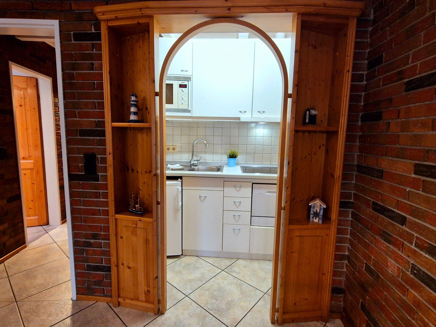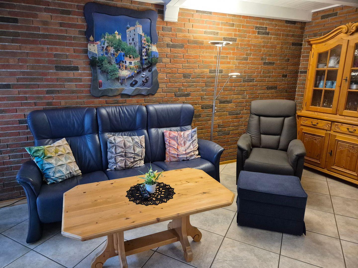 Wohn- Esszimmer mit TV-Flachbildschirm, Radio, Couch und Esstisch. Offene moderne Küche mit 4-Platten Ceranherd, Kühlschrank mit Gefrierfach, Kaffeemaschine, Wasserkocher, Eierkocher, Toaster, Mikrowelle und Geschirrspüler.