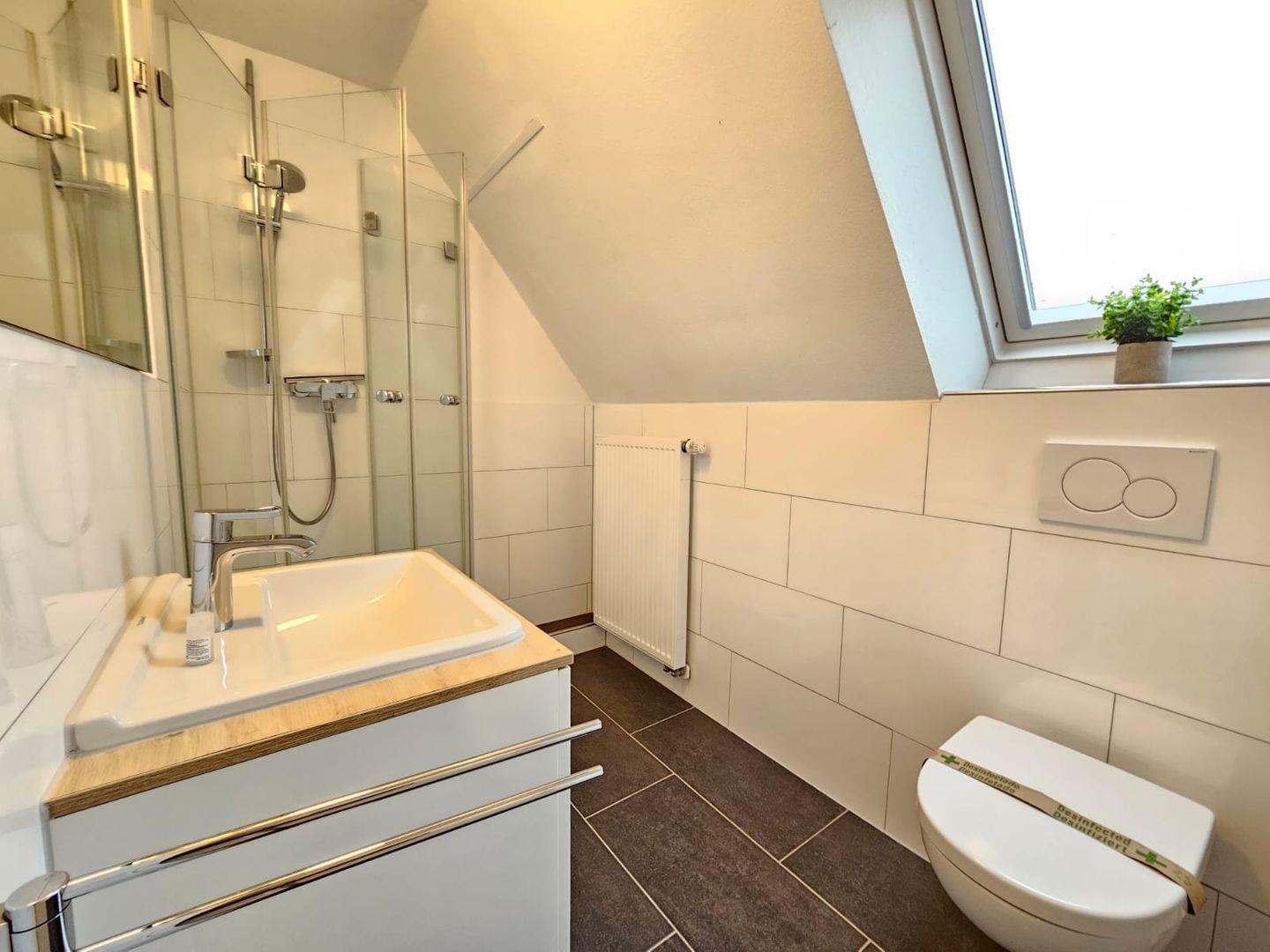 Das freundliche Schlafzimmer bietet erholsame Nächte, während das helle Bad mit Fenster modernen Komfort bietet. Alle Fenster sind mit Plissees und Rollläden ausgestattet, sodass Sie den Raum individuell verdunkeln können. Bettwäsche und Handtücher können gegen Aufpreis hinzugebucht werden.
