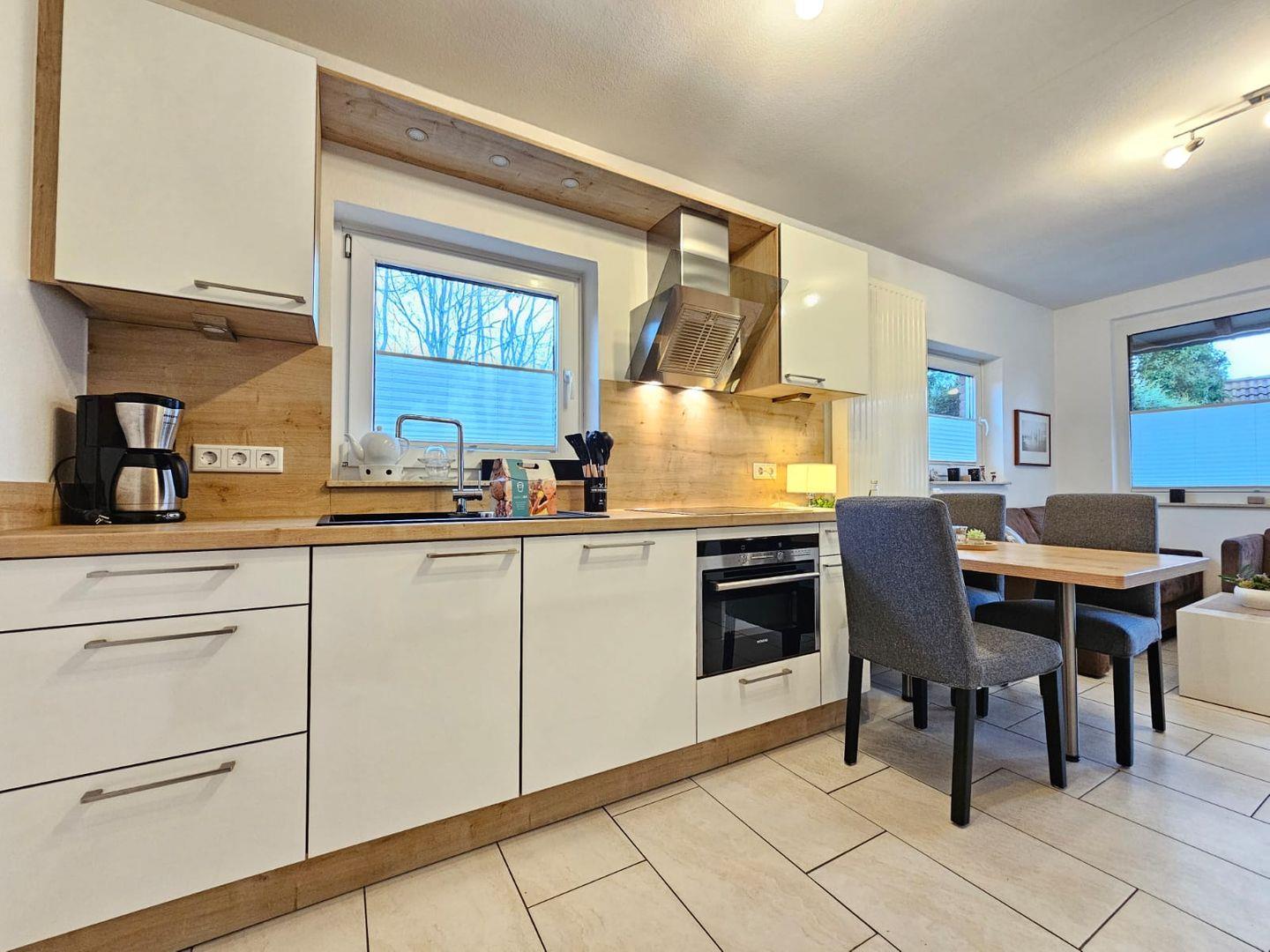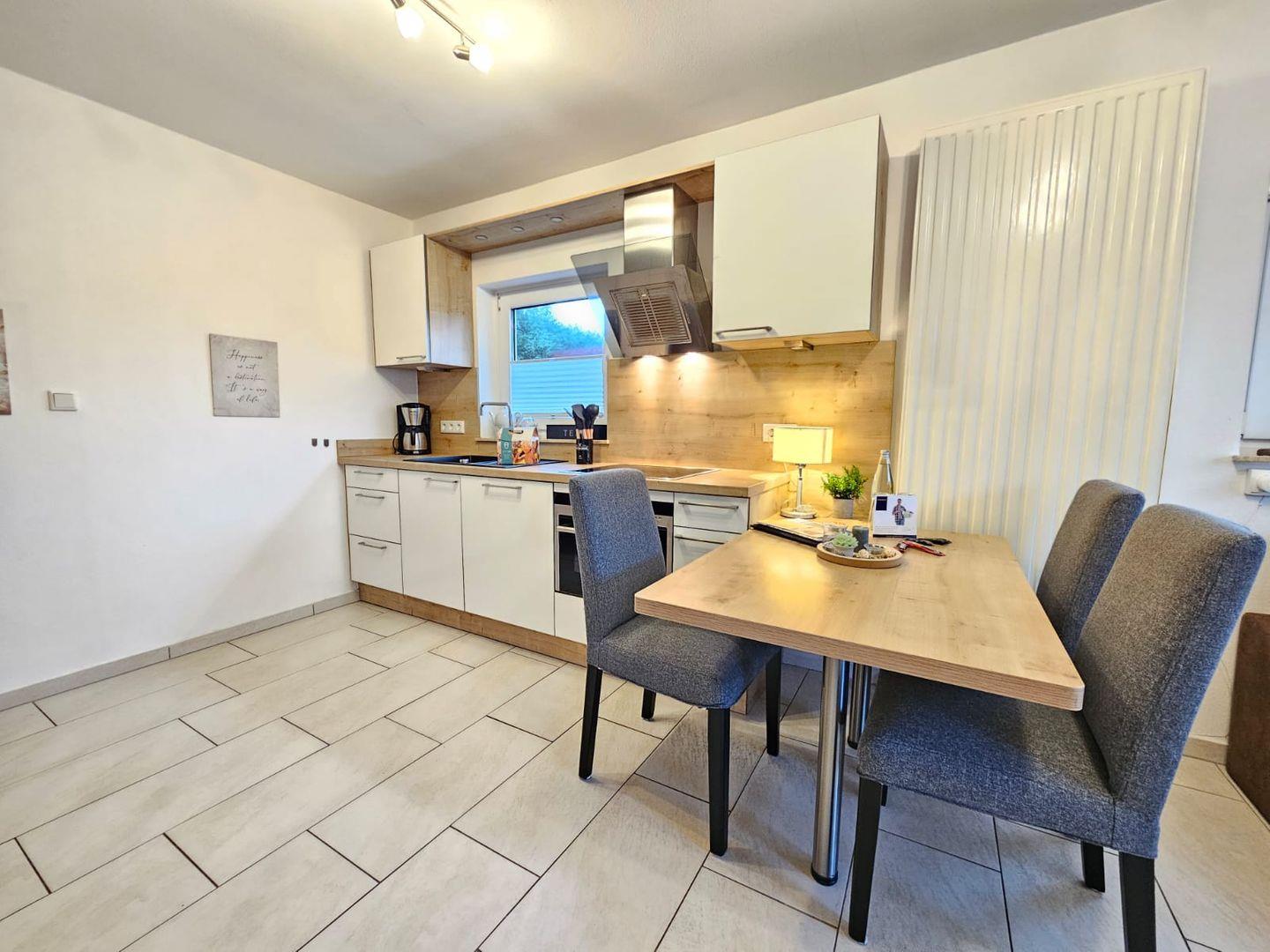 Die Ferienwohnung Boppo verfügt über einen hellen und offenen Wohnbereich mit Wohnküche, die vollständig ausgestattet ist. Hier finden Sie alles, was Sie für eine unkomplizierte Selbstversorgung benötigen: Ceranfeld, Backofen, Kühlschrank mit Gefrierfach, Kaffeemaschine, Wasserkocher, Toaster und ausreichend Küchenutensilien. Ein Esstisch für vier Personen lädt zum gemeinsamen Essen ein, während die Sofaecke mit gemütlicher Sitzgelegenheit zum Entspannen nach einem erlebnisreichen Tag an der Nordsee einlädt.