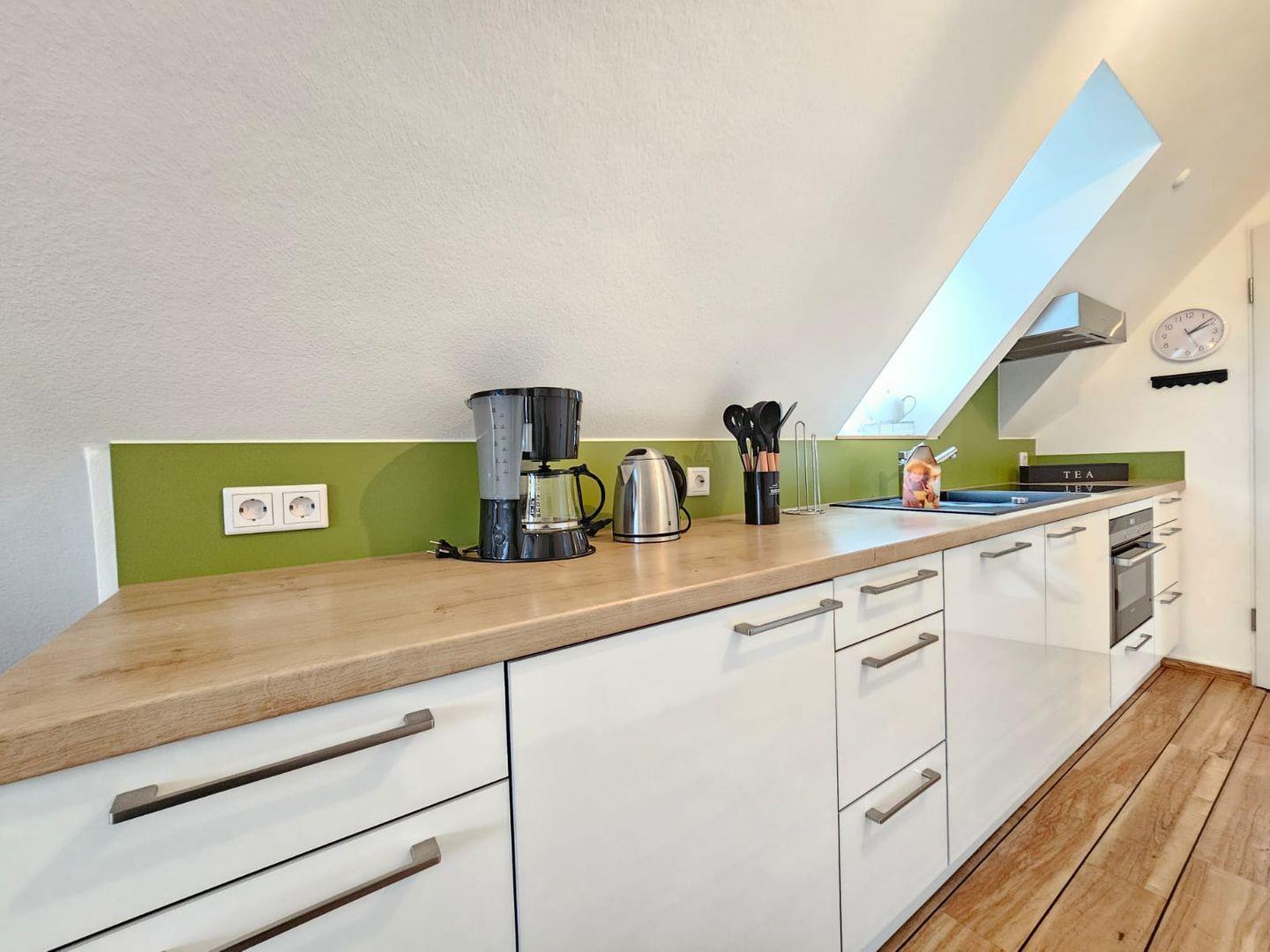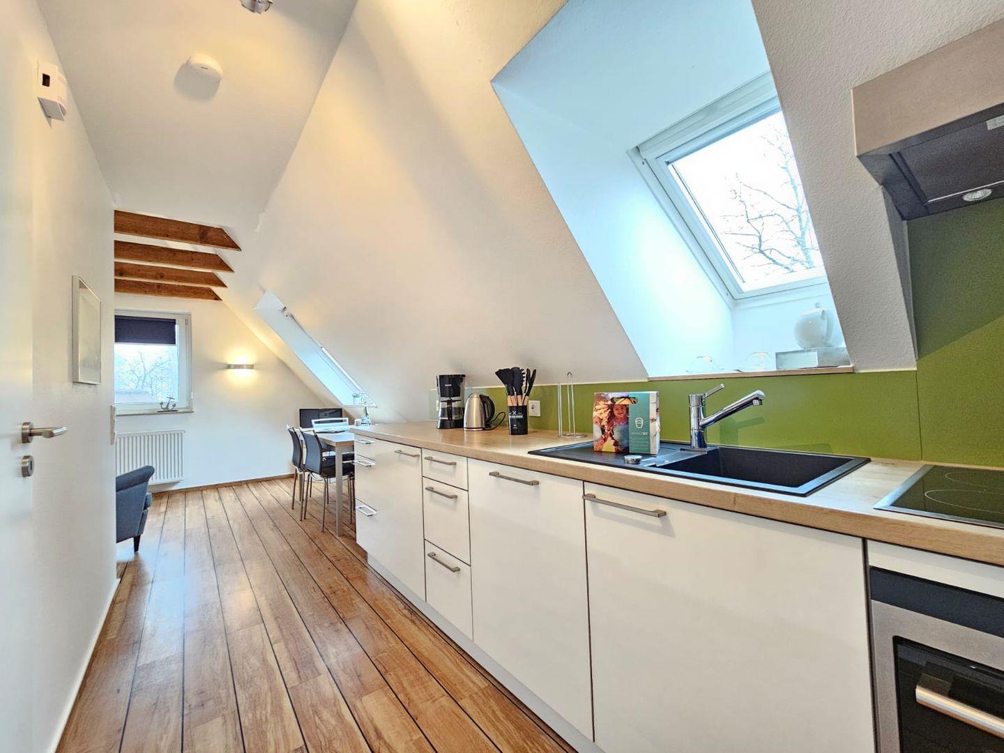Die Wohnküche mit vollständig ausgestatteter Küche, Tisch fürvier Personen und Sofaecke, ein freundliches Schlafzimmer, ein helles Bad mit Fenster finden Sie in der Ferienwohnung.