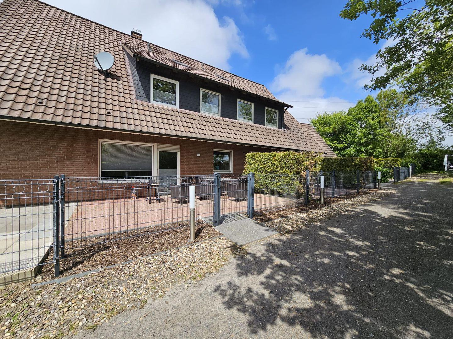 Hinter dem Haus befindet sich eine Grünfläche, die zum Spielen und Toben einlädt. Eine gemeinschaftliche Terrasse mit Gartenmöbeln und zwei Grills steht allen Gästen zur Verfügung. Aus Rücksicht auf die Kinder sind Hunde in diesem Bereich leider nicht erlaubt.