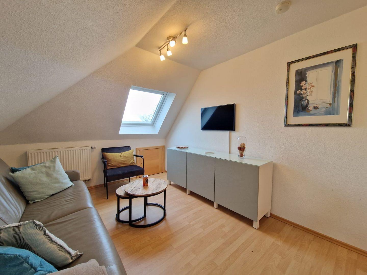 Die OG Wohnung ist über eine separate Außentreppe zu erreichen. Eine gemütliche Küche mit Essplatz und allem was gebraucht wird ist durch einen Raumteiler vom gemütlichen Wohnzimmer getrennt.