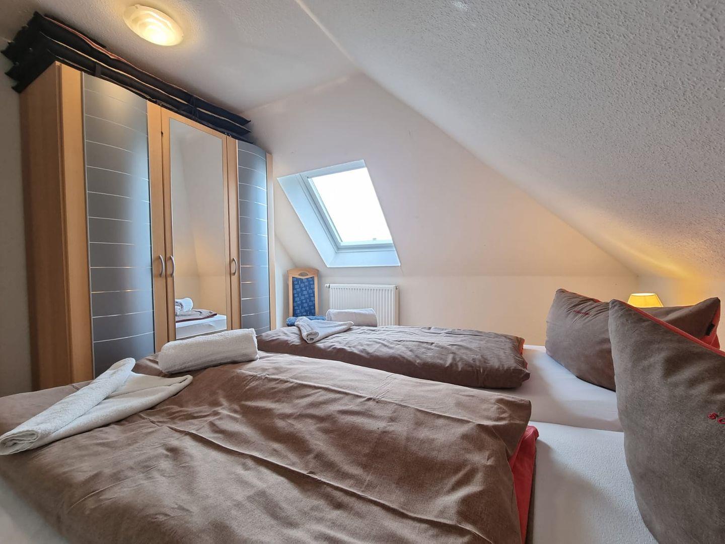 Schlafzimmer: Helle und freundlich eingerichtete Schlafräume für 3 Personen, zusätzlich steht ein Kinder-Reisebett bereit.