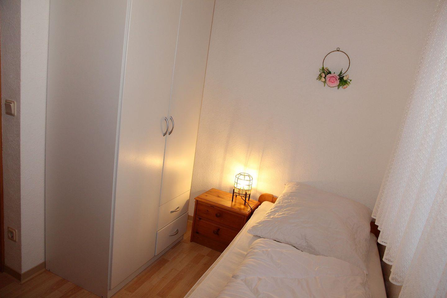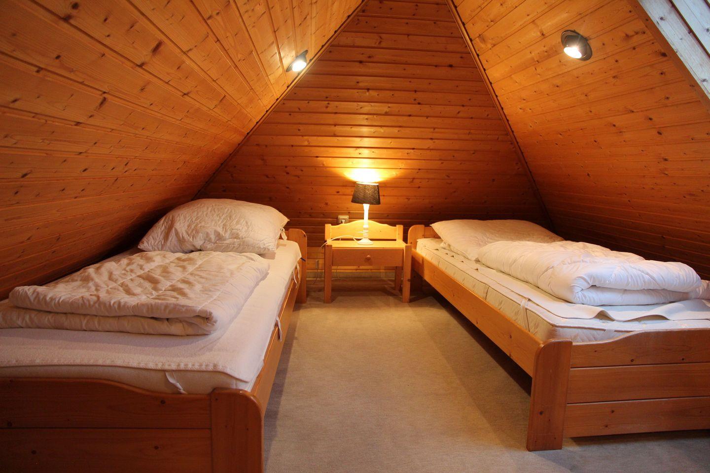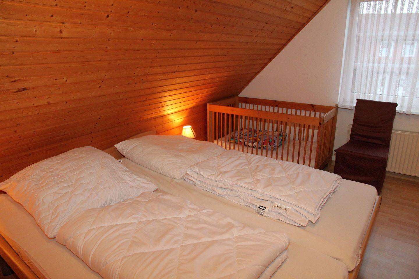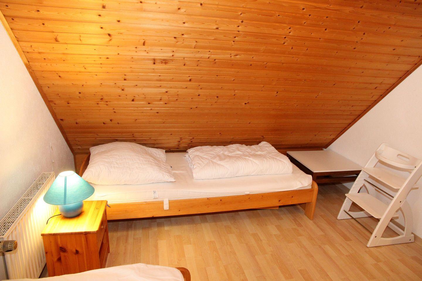 Im 2. OG befindet sich unter den Dachschrägen ein kleines gemütliches Schlafzimmer mit 2 Einzelbetten (90x200cm), bestes geeignet für etwas größere Kinder. Der Fußboden ist mit Teppich ausgelegt.