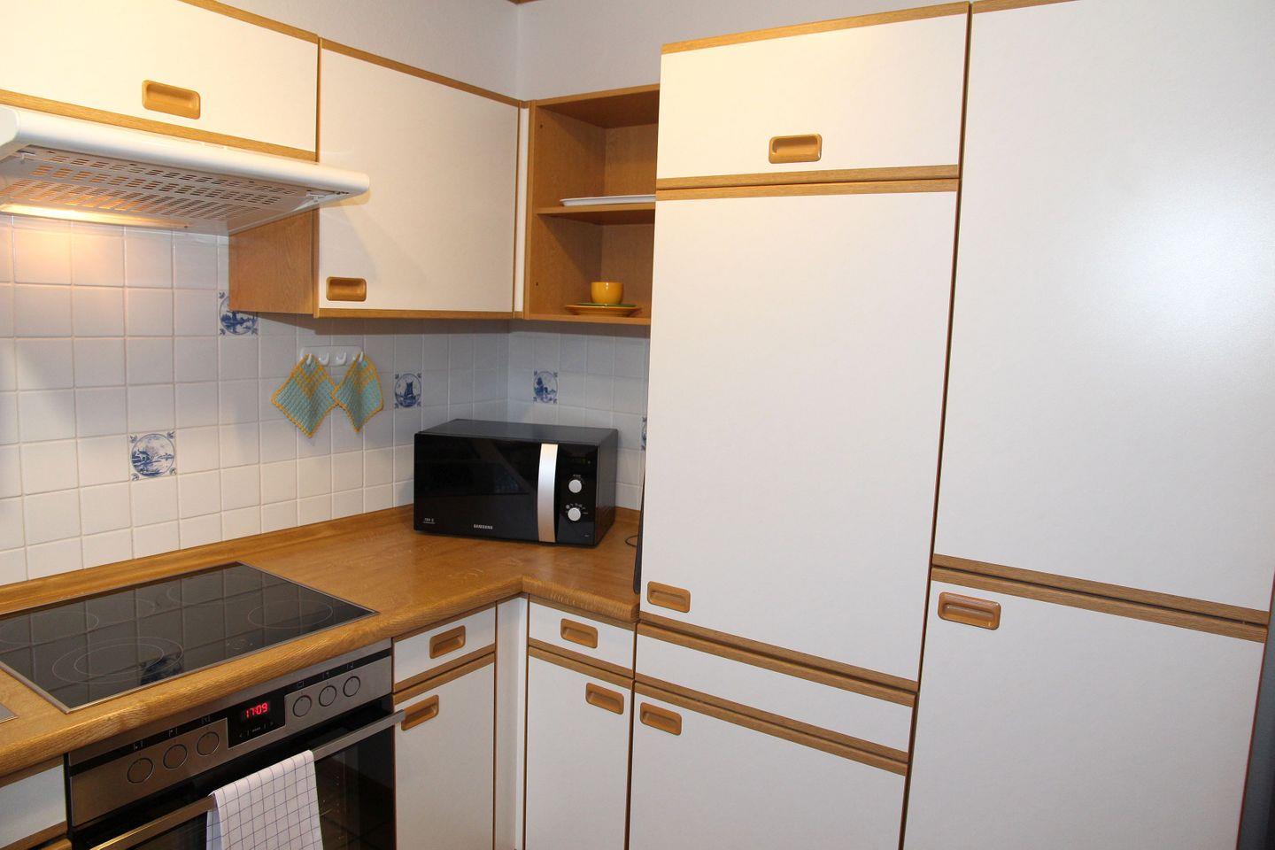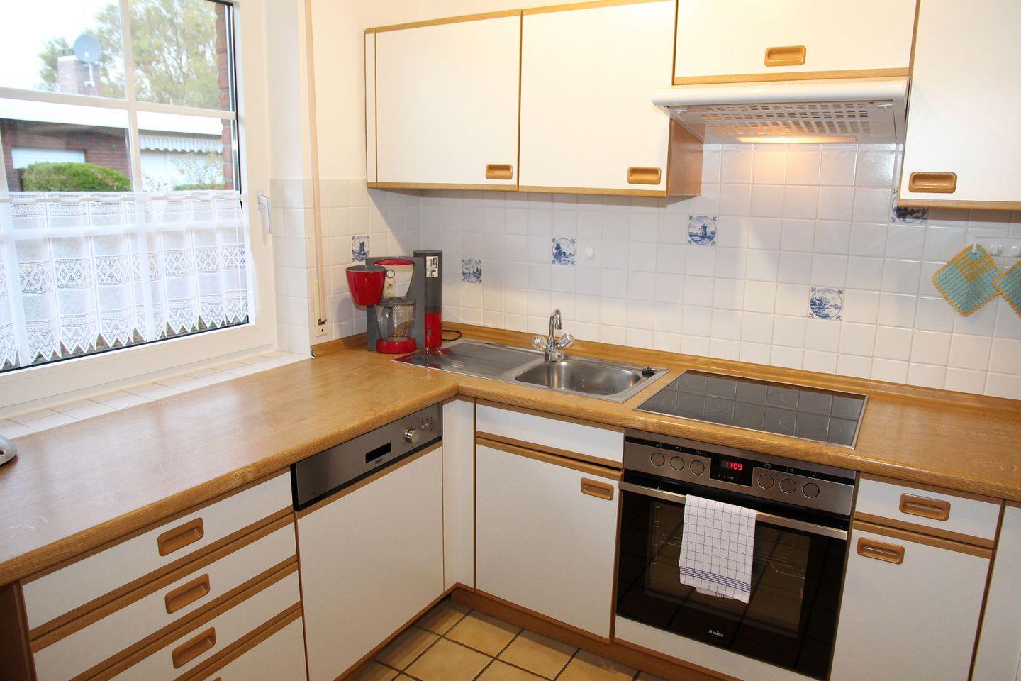 Die Küche mit viel Stauraum ist komplett ausgestattet (Geschirrspülmaschine, Kühlschrank mit Gefrierfach, Mikrowelle, Backofen, Herd, Toaster, Kaffeemaschine, Mixer, ausreichend Geschirr und Gläser)