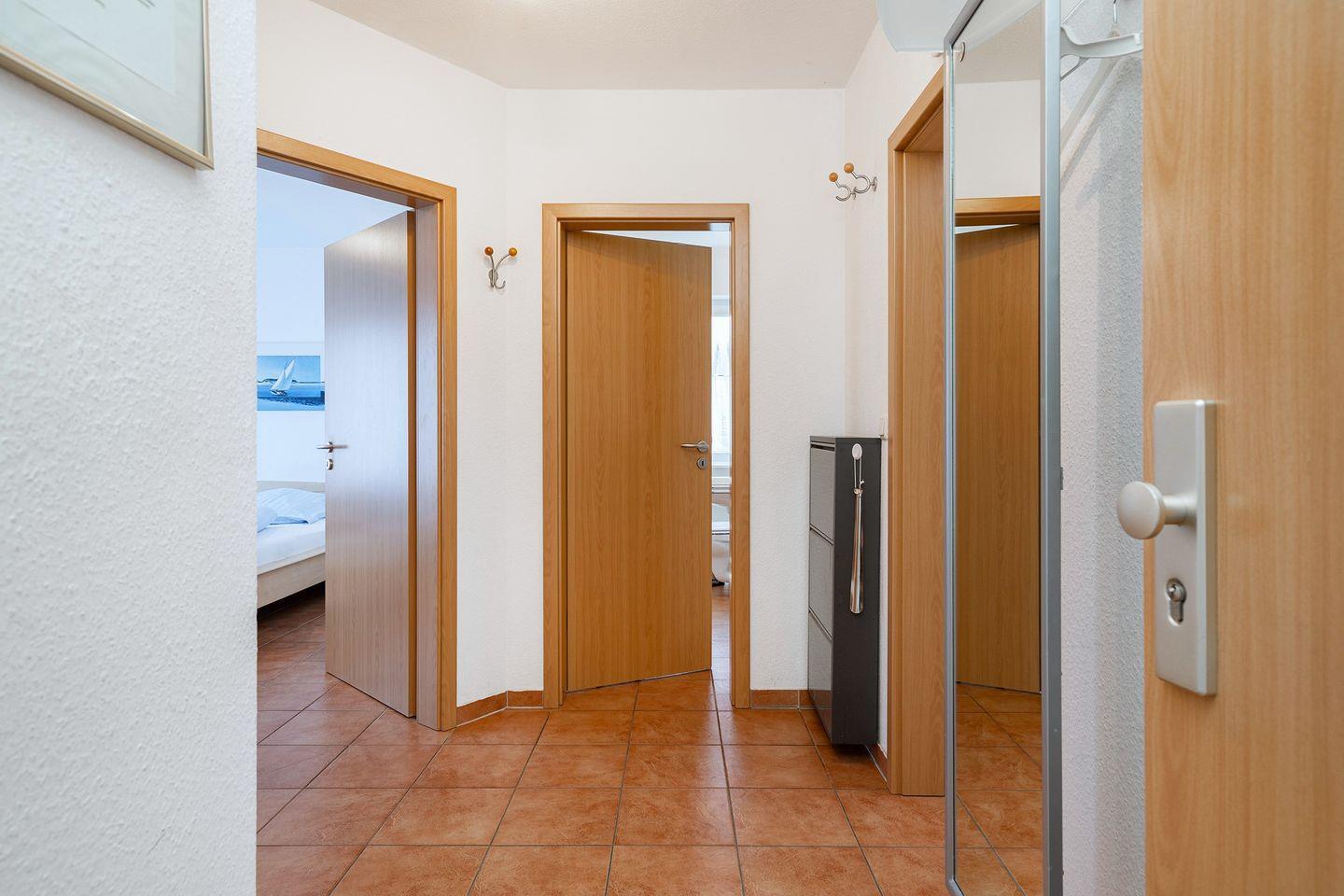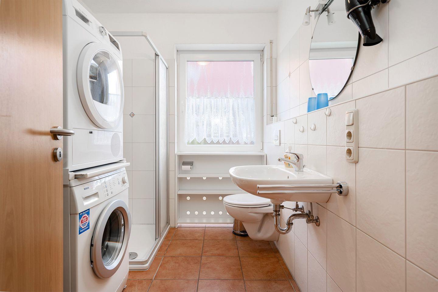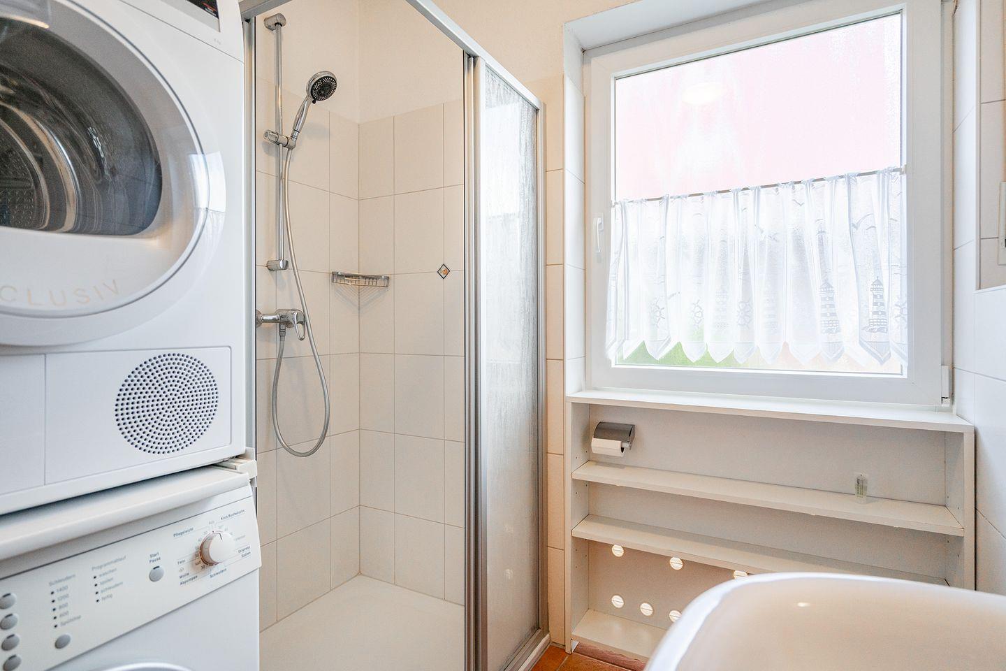 2 Schlafräume, Dusch-Bad mit Hänge-WC, Waschmaschine und Trockner, beheiztem Handtuchhalter und Föhn sowie Bügeleisen und Bügelbrett. Dusche mit niedrigem Einstieg. Bis auf die beiden Schlafräume, verfügt die Wohnung über eine angenehme Fußbodenerwärmung. Alle Fenster haben Außenrollos. Terrasse mit Mobiliar und Elektrogrill. Ein Bollerwagen steht zur Verfügung (ohne Garantie).