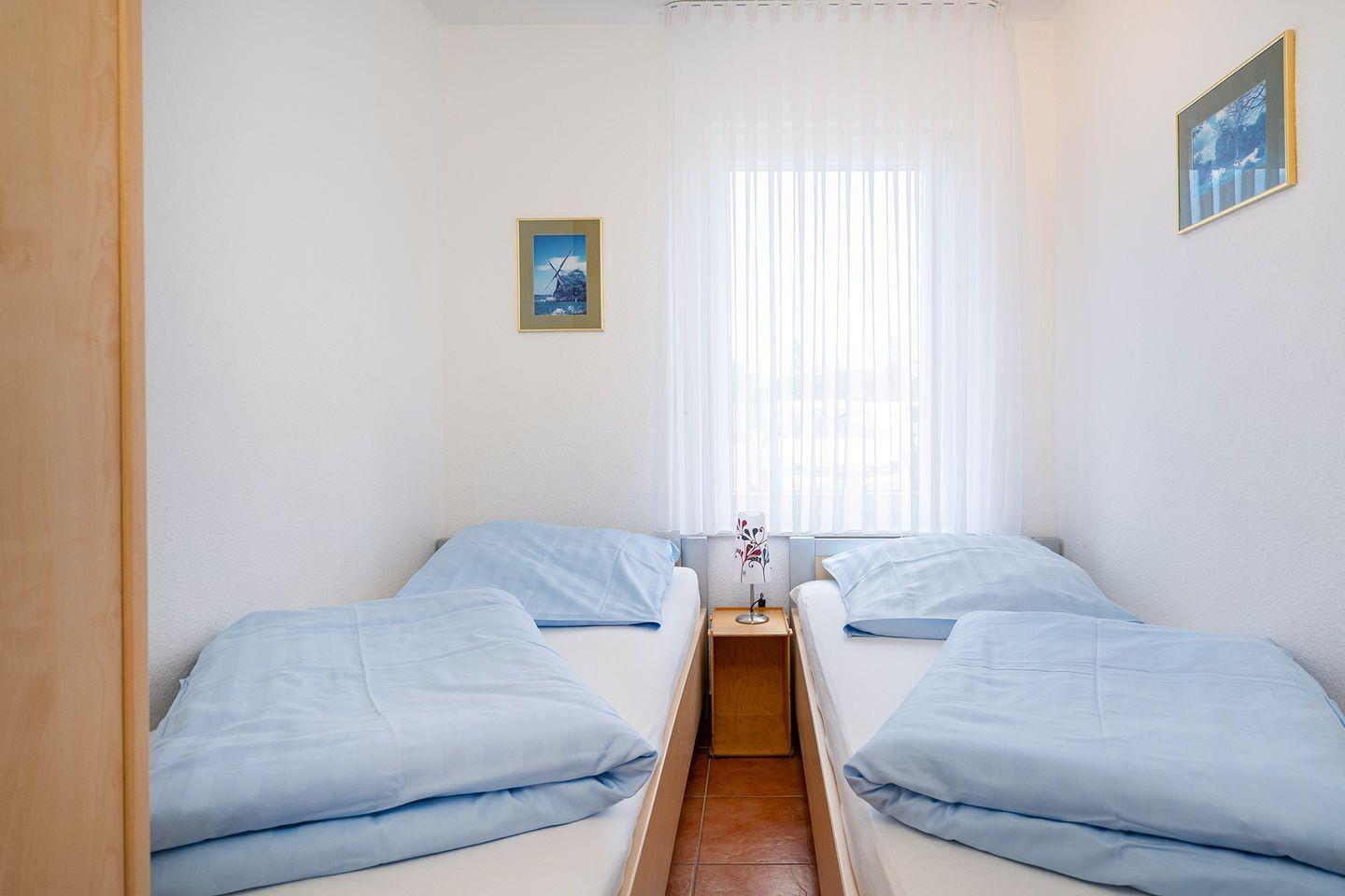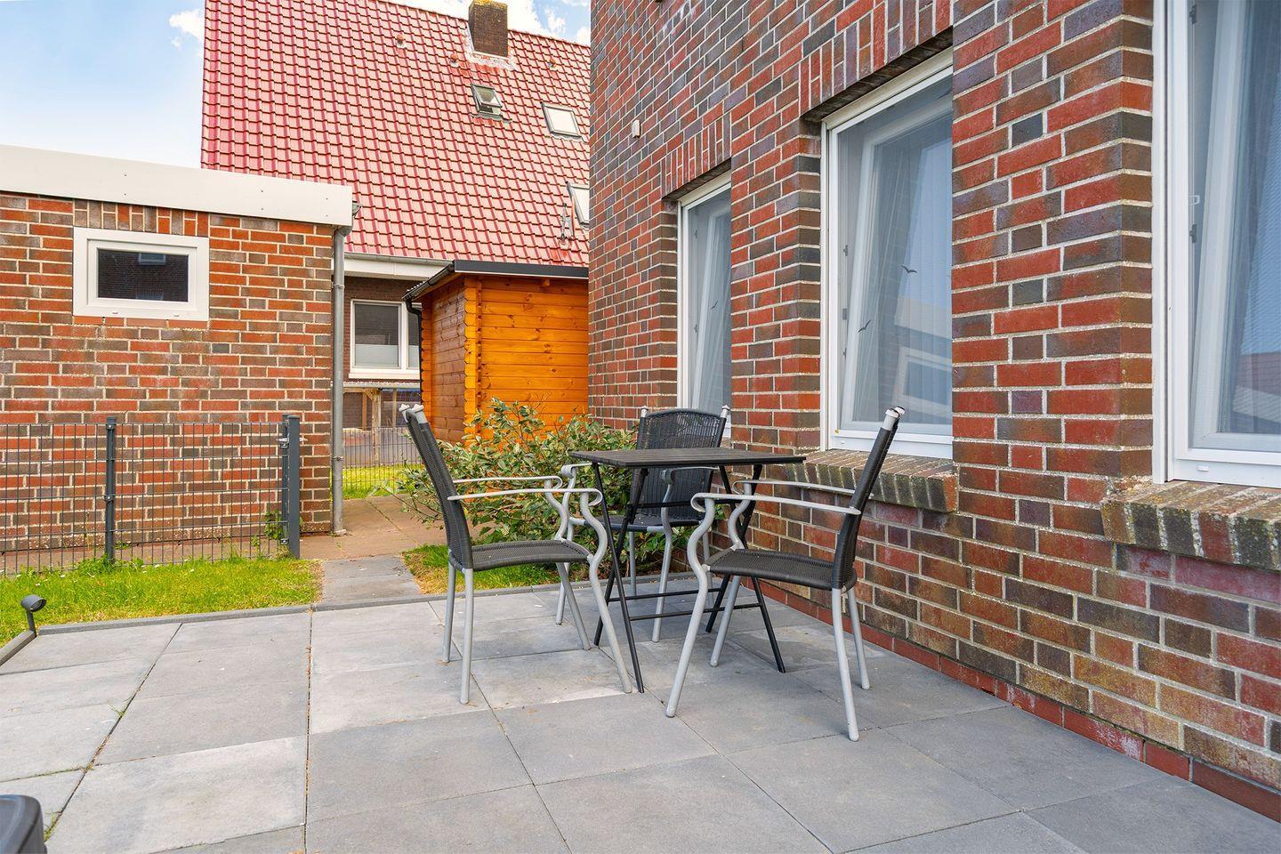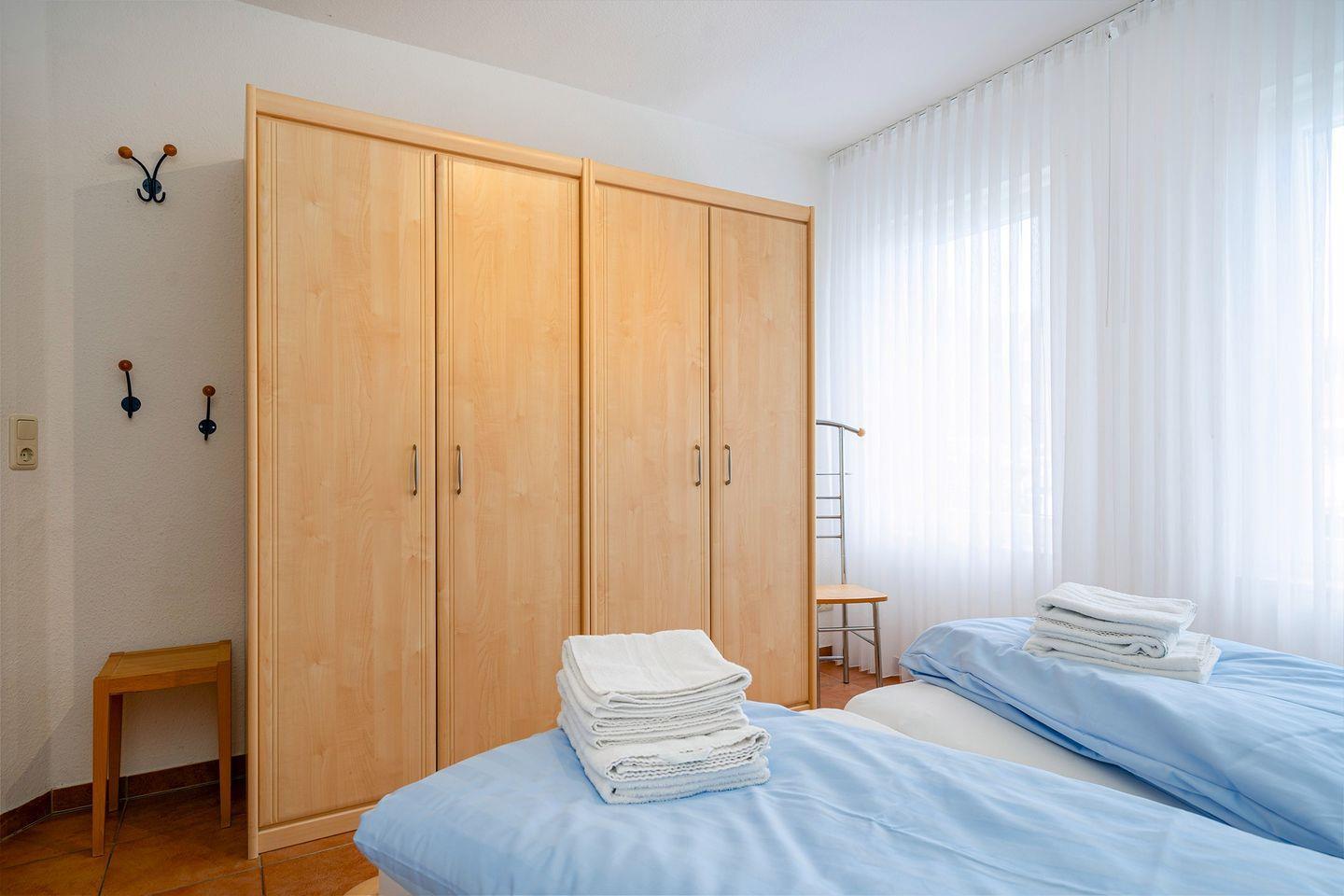 2 Schlafräume, Dusch-Bad mit Hänge-WC, Waschmaschine und Trockner, beheiztem Handtuchhalter und Föhn sowie Bügeleisen und Bügelbrett. Dusche mit niedrigem Einstieg. Bis auf die beiden Schlafräume, verfügt die Wohnung über eine angenehme Fußbodenerwärmung. Alle Fenster haben Außenrollos. Terrasse mit Mobiliar und Elektrogrill. Ein Bollerwagen steht zur Verfügung (ohne Garantie).