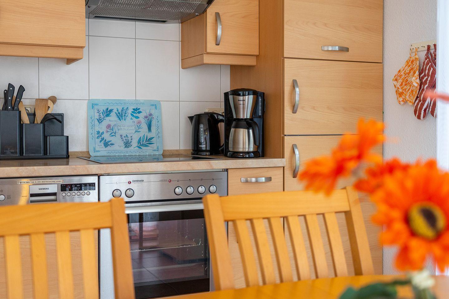 Großer Wohn-/Essbereich mit voll ausgestatteter Küche z.B. Gefrierfach, Geschirrspüler, Mikrowelle, Wasserkocher, Kaffeemaschine, Raclettegrill, Toaster, etc., DVD-Player, Hifi-Anlage mit MP3 und USB.