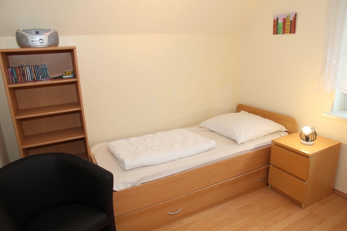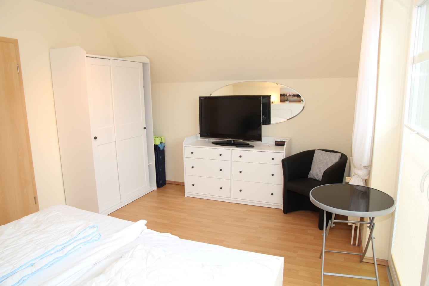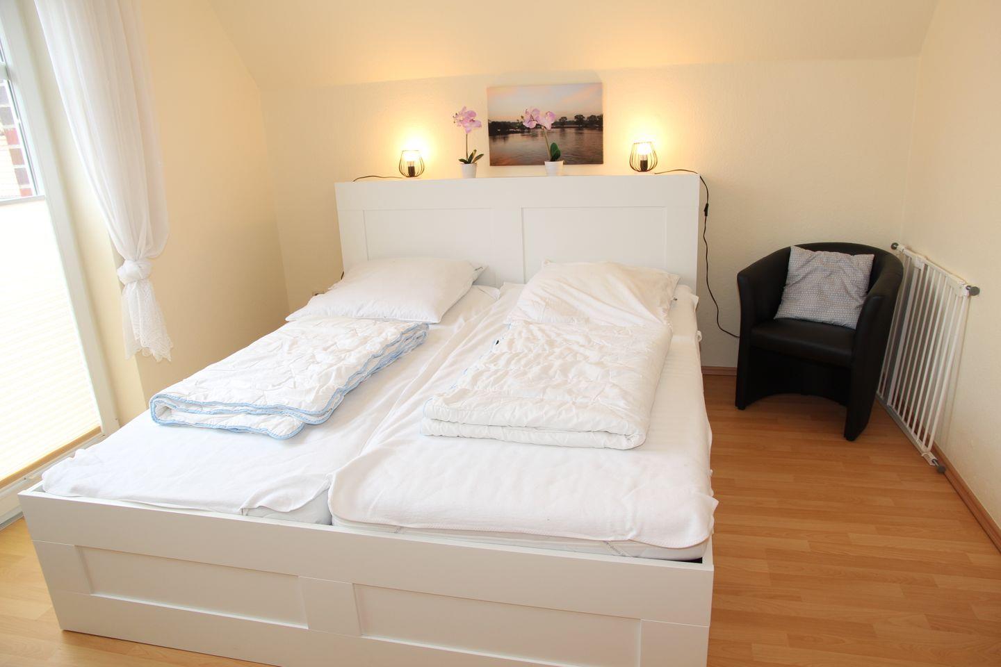 Im Obergeschoß sind 2 große Schlafräume (1 * mit Doppelbett, 1 * mit 1 Einzelbett und 1 Funktionsbett mit zwei Liegeflächen), die beide 2023 renoviert wurden. Beide Schlafräume verfügen über einen Fernseher und in einem ist ein Musikrekorder vorhanden. Ebenso haben beide Schlafräume Außenrollläden. Im Wohnbereich besteht keine Verdunklungsmöglichkeit. Dusch-Bad mit WC .