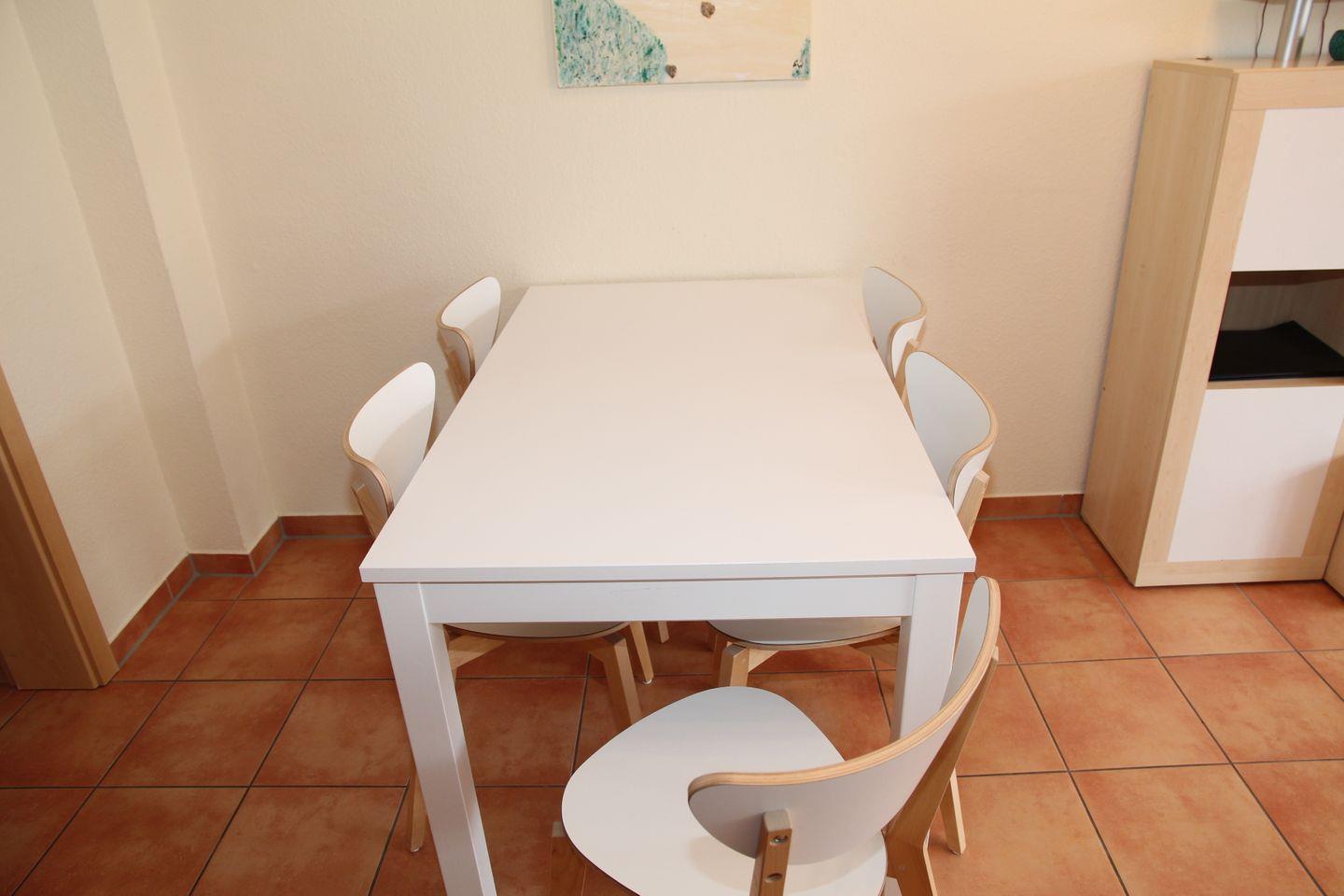 Die Terrasse ist mit Mobiliar ausgestattet, Stapelstühle und ein Beistelltisch, sowie ein Sonnenschirm und ein Grill sind vorhanden. Hochstuhl und Kinderbett werden kostenlos zur Verfügung gestellt, sowie Spiele, Bücher, DVDs und Hörspielkassetten. Im OG befindet sich ein Treppenschutz. Außerdem steht ein Bollerwagen zur Nutzung, z.B. für Ausflüge zum Strand, bereit.