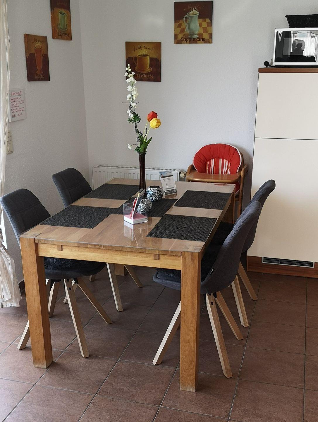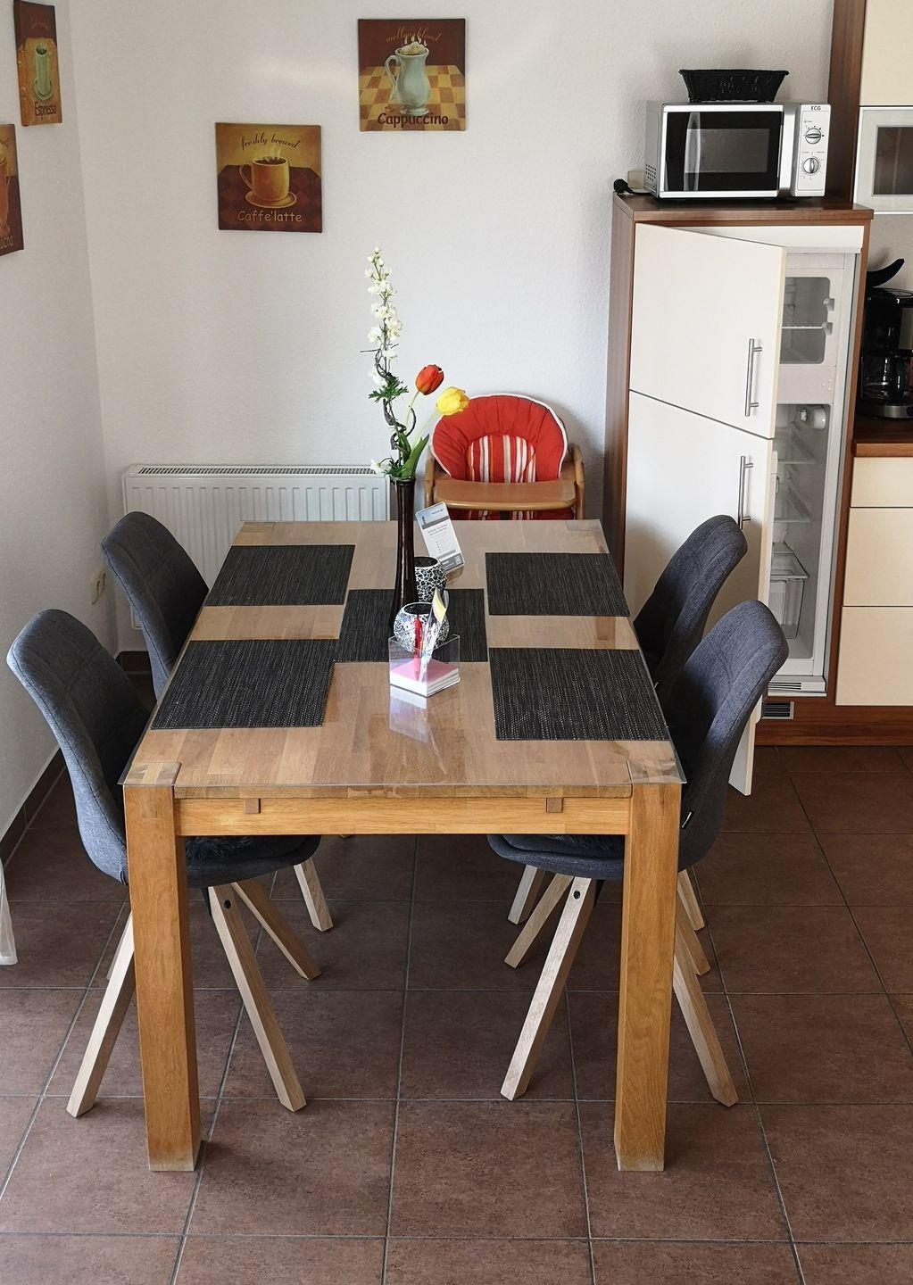 Großer Wohn-Essbereich mit voll ausgestatteter Küche z. B. Ceran-Kochfeld, Geschirrspüler, Gefrierfach, Wasserkocher, Mikrowelle, Kaffeemaschine, Kaffeekapselmaschine "Dolce Gusto", Tischgrill, etc., Radio-CD-Player, Flachbild-TV (101 cm) und DVD-Player. Das gemütliche L-Sofa wurde im November 2023 angeschafft.
