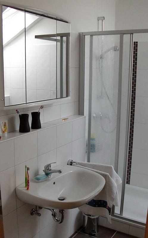 Es gibt zwei gemütliche Schlafräume mit Landhausdielenlaminat und Außenrollläden, eines mit Doppelbett (2x 90cm Matratzen) und eines mit zwei Einzelbetten (90cm Matratzen). Das Tageslicht-Badezimmer verfügt über Dusche, Waschbecken, Waschmaschine, Fön und WC.