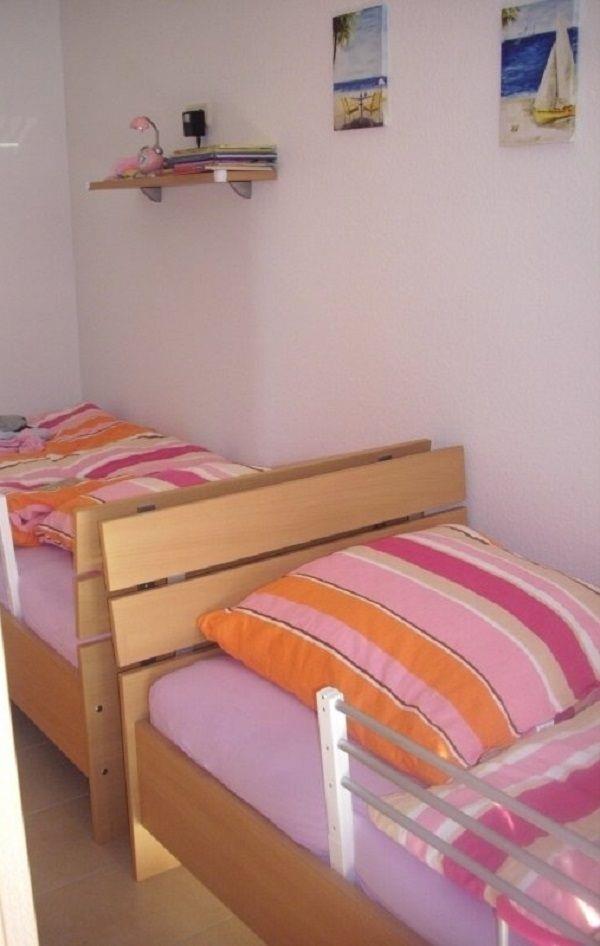 Vorhanden sind 2 Schlafzimmer (1 Doppelbett + 2 Einzelbetten) die beiden Einzelbetten können jeweils mit einem Bettgitter versehen werden. Beide Schlafzimmer sind mit Verdunklungsplisees versehen. Das moderne Badezimmer mit Dusche, Handtuchheizung, Waschmaschine und Trockner läßt ebenfalls keine Wünsche offen.