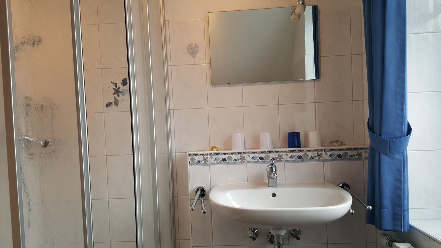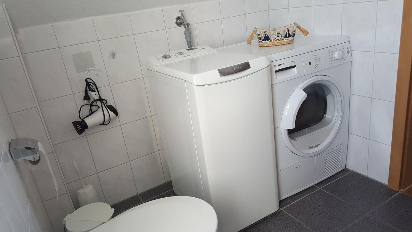 Das schöne Duschbad ist mit einer Wasch- und Trockenmaschine ausgestattet.