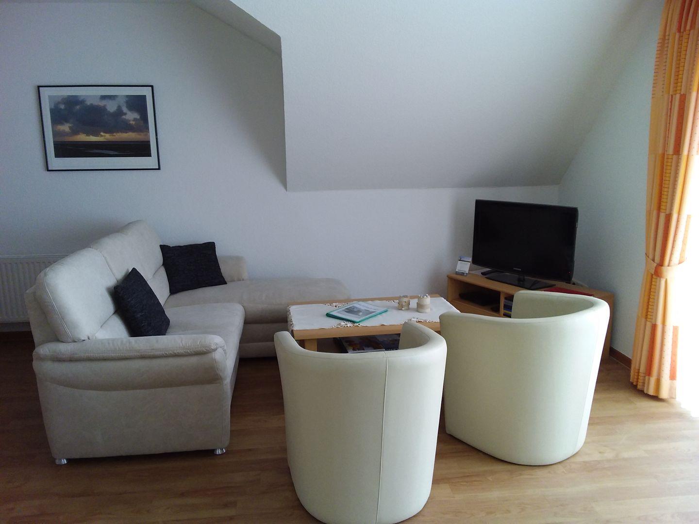 Der gemütliche Wohnbereich hat einen Flachbildfernseher und eine Musikanlage mit USB-Anschluss.