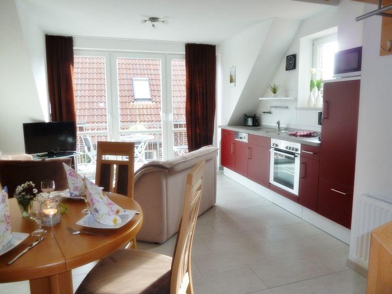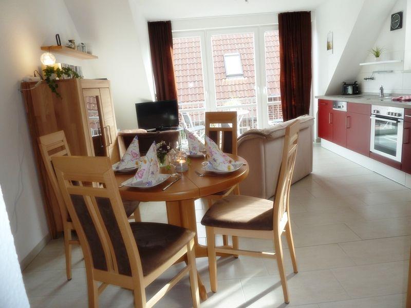 Der Wohn-Essbereich ist hell und freundlich eingerichtet. Die neue Küche ist komplett ausgestattet mit allem, was das Urlauberherz begehrt. Es gibt eine Geschirrspülmaschine, einen Backofen, eine Mikrowelle, einen Kühlschrank mit Gefrierfach, eine Kaffeemaschine und vieles mehr. Der Wohnraum ist gefliest und verfügt über eine angenehme Fußbodenerwärmung und Plissees an Fenster und Balkontür.