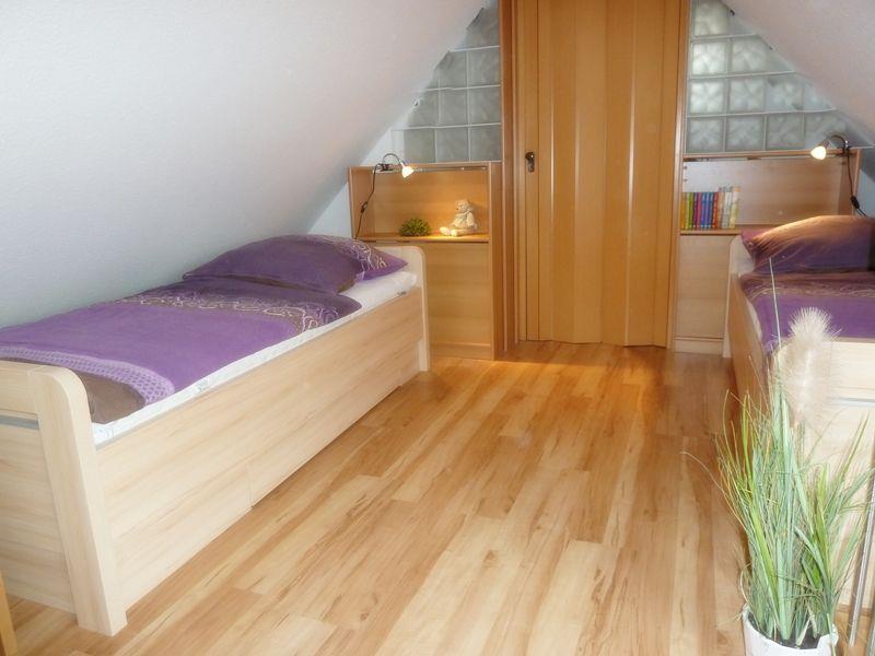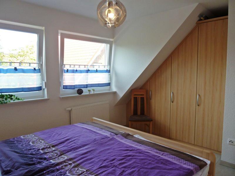 Das Schlafzimmer im 1. OG ist gemütlich eingerichtet, mit einem Doppelbett und einem großen Kleiderschrank. Außenjalousien können den Raum komplett abdunkeln. Das Schlafzimmer im 2. OG verfügt über 2 Einzelbetten (0,90x2,00 m) und genügend Stauraum für Ihre mitgebrachten Sachen. 2. TV mit DVD im OG vorhanden! Das große Veluxfenster lässt sich komplett abdunkeln. Dieser Raum verfügt auch über eine separate Toilette und Waschbecken.