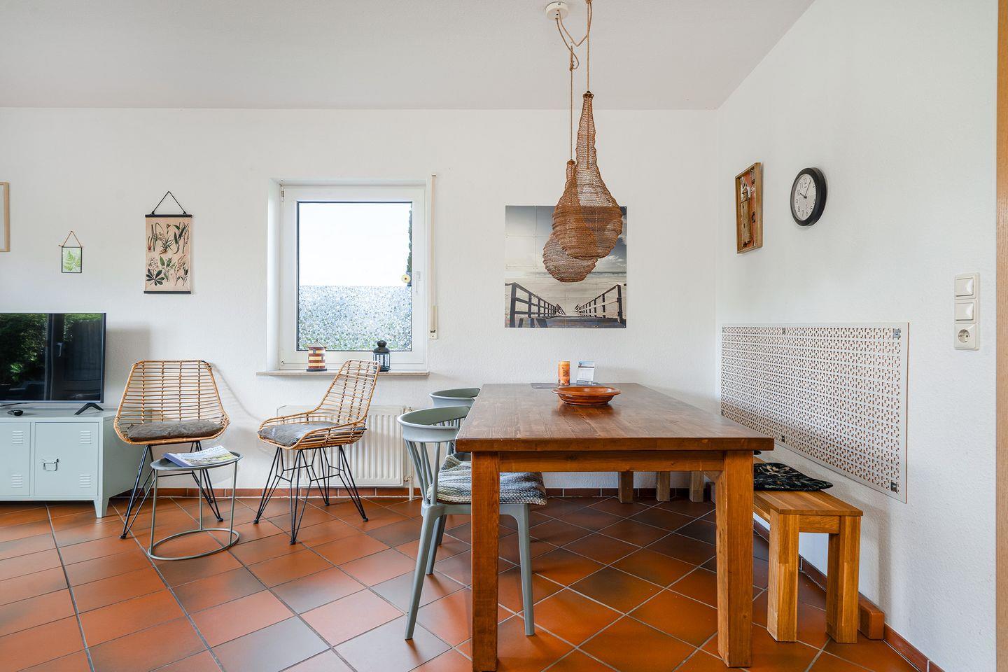Großer Wohn-/Essbereich mit gemütlicher Sofaecke und SAT-TV mit DVD-Player. Separate voll ausgestattete kleine Küche mit z.B. Gefrierfach, Geschirrspüler, Mikrowelle, Wasserkocher, Filter-Kaffeemaschine, Ceranfeld und Backofen. Ein Hochstuhl für die kleinen Gäste ist vorhanden.