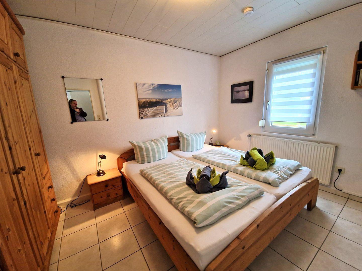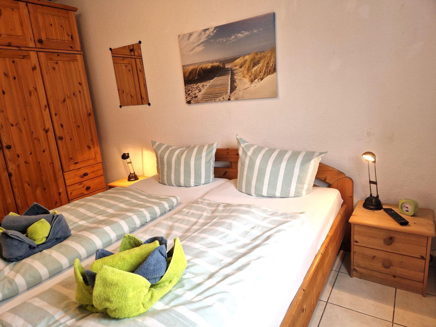 Im Schlafzimmer finden sie Ruhe und Entspannung. Es stört kein Straßenverkehrslärm, da das Haus in einer ruhigen parkähnlichen Gartenanlage ohne Durchgangsverkehr liegt. Für die Kinder ist ein 2. Schlafzimmer mit einem Etagenbett vorhanden.