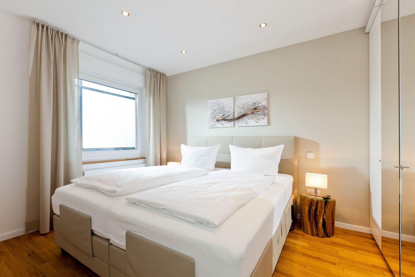 Ruhige Lage, strand- und zentrumsnah, moderne Ferienwohnung für 2 Personen mit einer Grüße von ca. 55m². Die Ferienwohnung wurde aufwendig renoviert und hochwertig und individuell eingerichtet.Das Schlafzimmer ist mit einem Doppelbett (elektr. Boxspringbett, 180cm) einem geräumigem Schrank und 40" Flat-TV ausgestattet. Im Wohnzimmer gibt es eine große Schlafcouch, einen Esstisch sowie einen 48" Flat TV. Die Küche ist voll ausgestattet. Das Bad hat eine flache Walk-In-Dusche und ein WC, im Abstellraum finden Sie eine Waschmaschine sowie weitere Haushaltsutensielien.Die Ferienwohnung verfügt über kostenloses W-LAN und Kabel-TV.