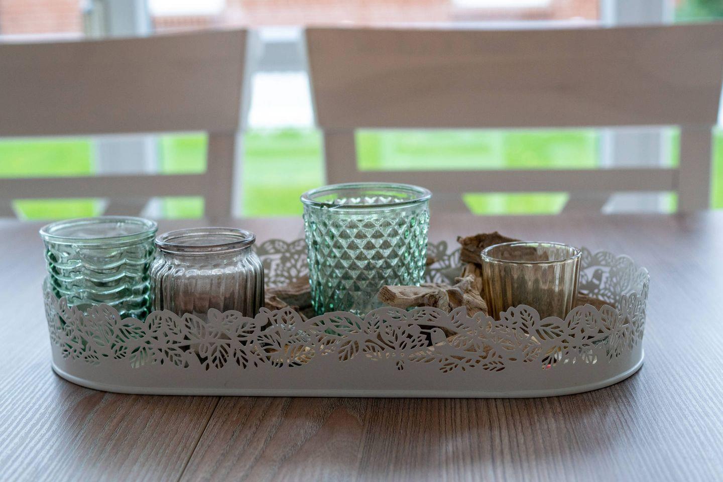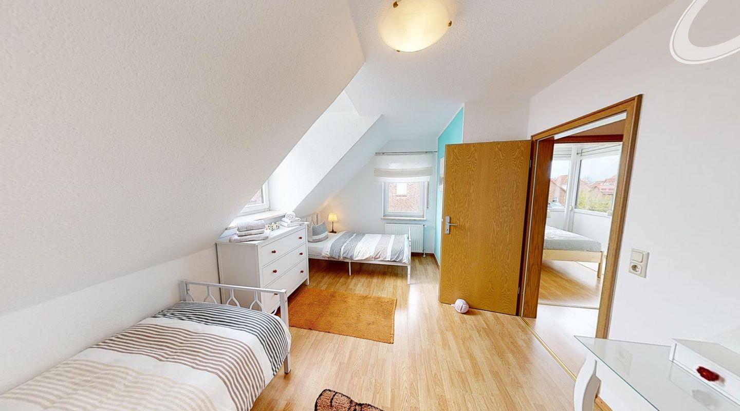 Die Doppelhaushälfte verfügt im Erdgeschoss über einen Wohn- und Essbereich mit voll ausgestatteter Küche, ein Gäste-WC und einen Abstellraum. Im Obergeschoss befinden sich drei Schlafzimmer und ein Duschbad mit WC. Zum Haus gehört eine Terrasse mit Garten. Hier stehen auch Spielgeräte für die Kinder bereit.
