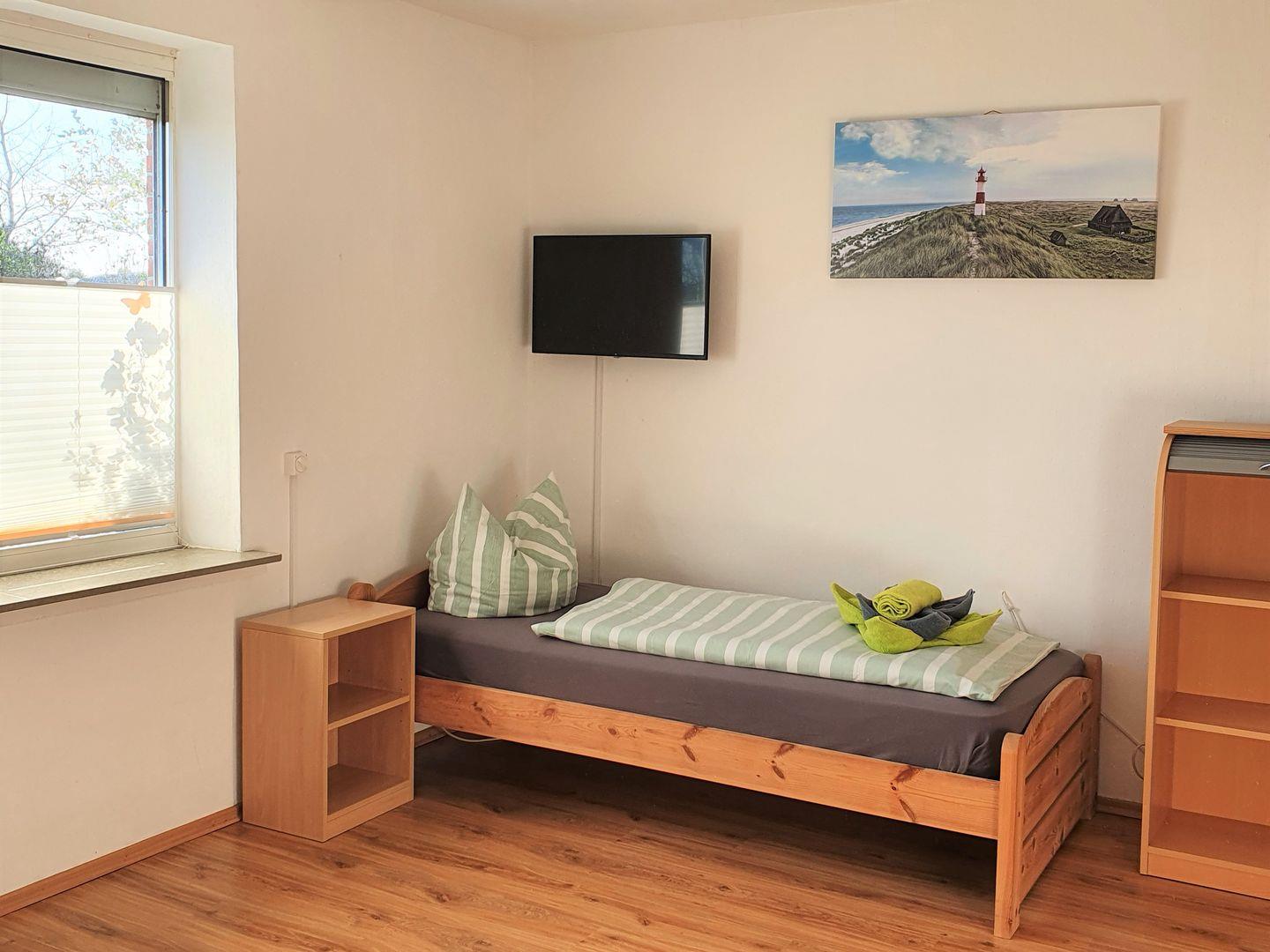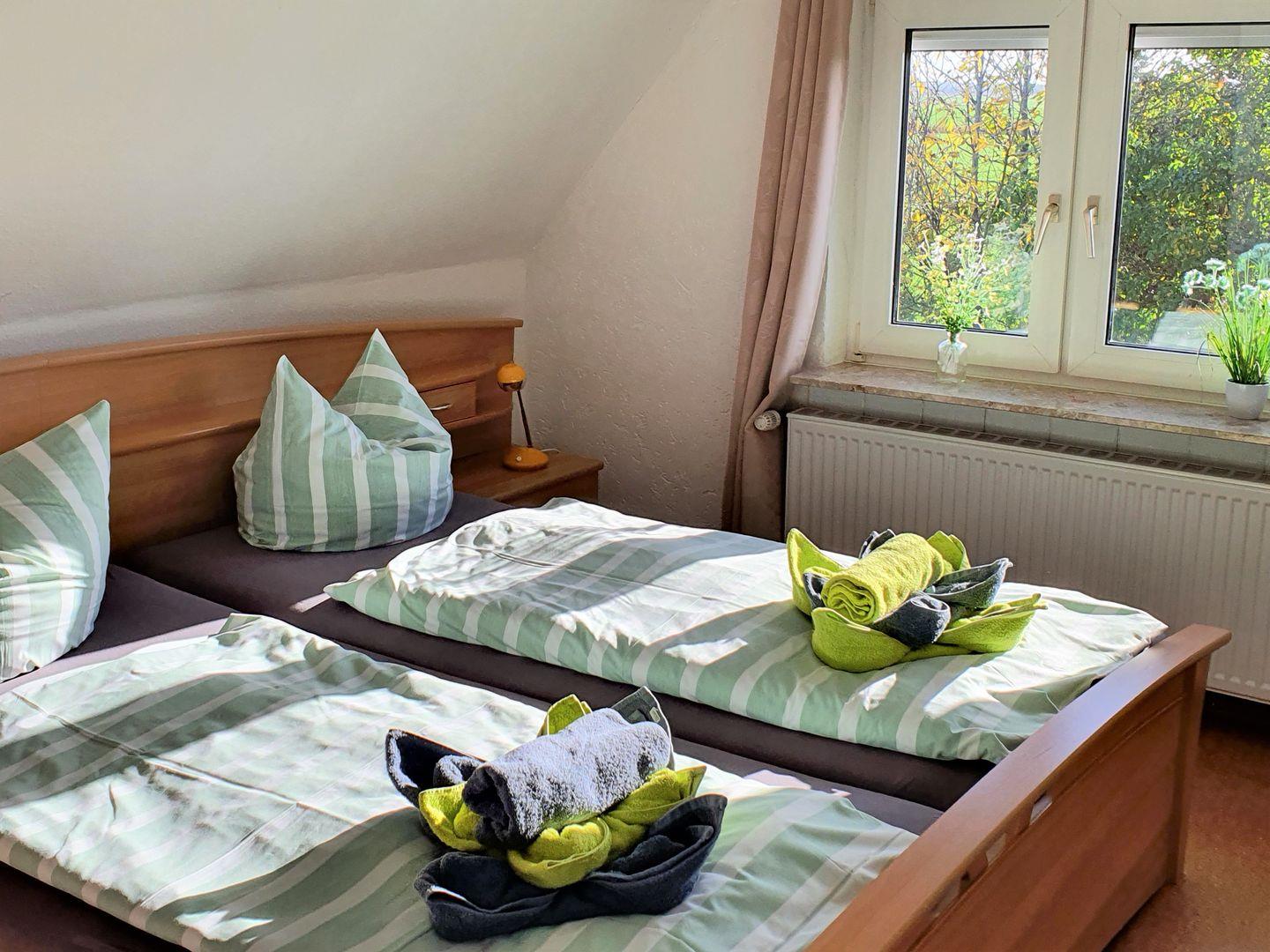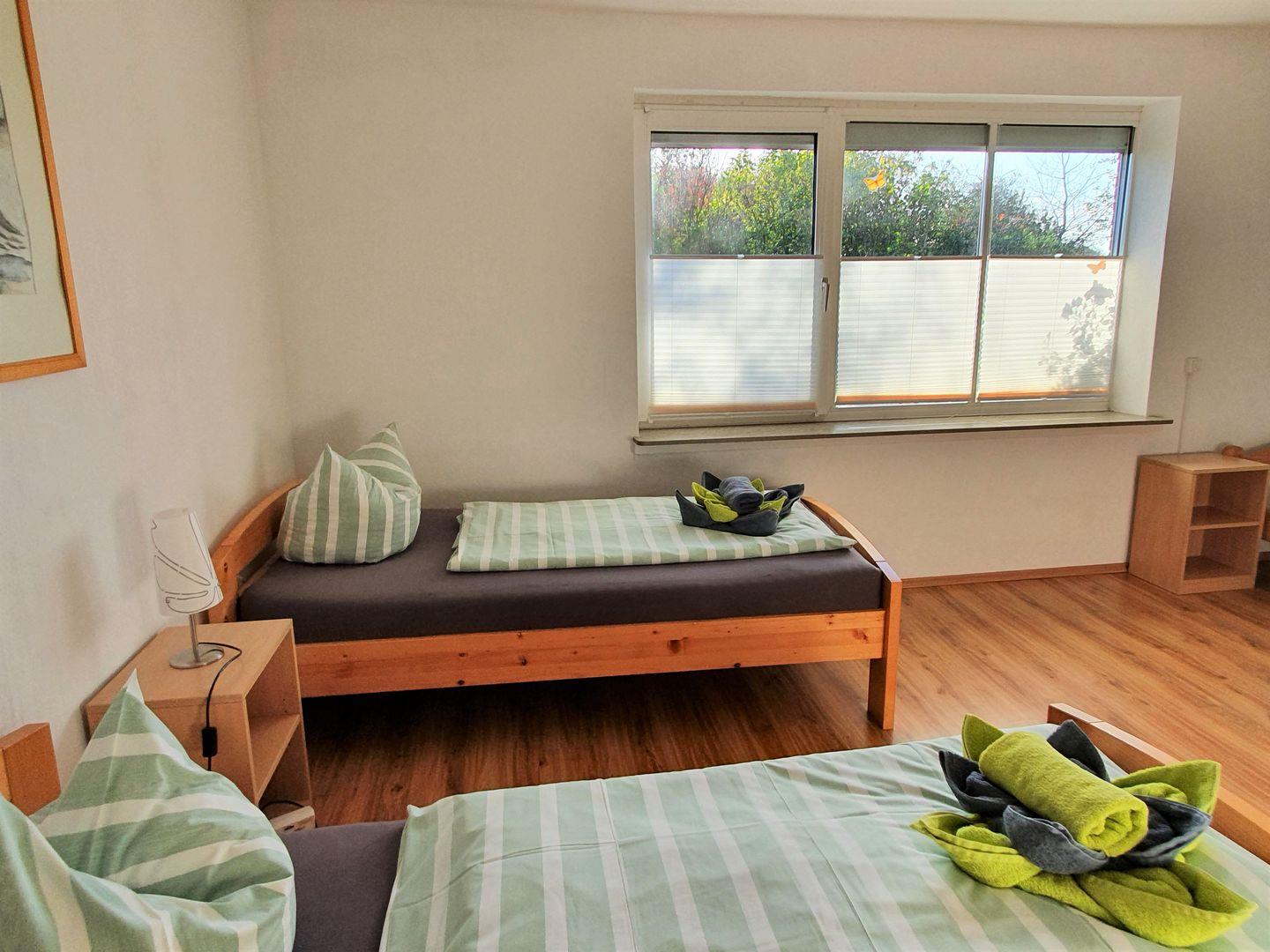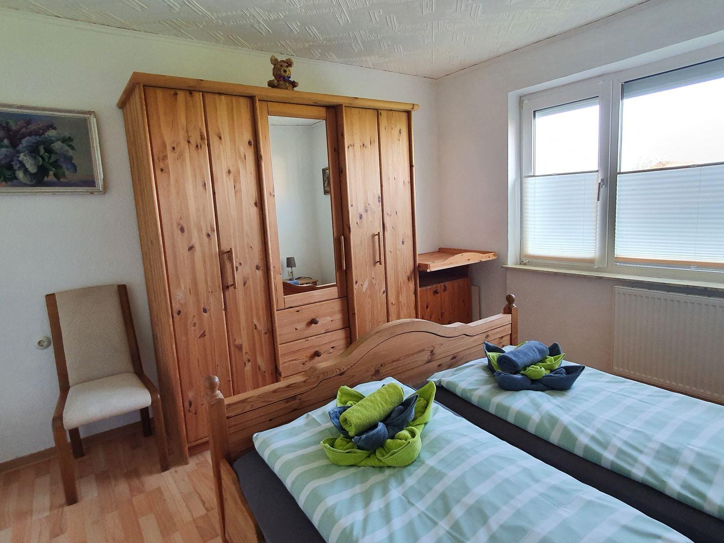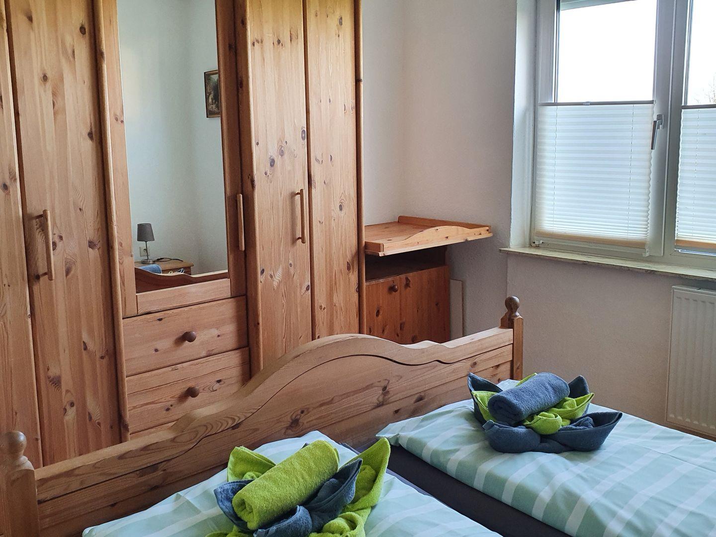Ferner sind im Erdgeschoss noch 2 Schlafzimmer, eins mit einem Doppelbett und ein weiteres mit 3 Einzelbetten.