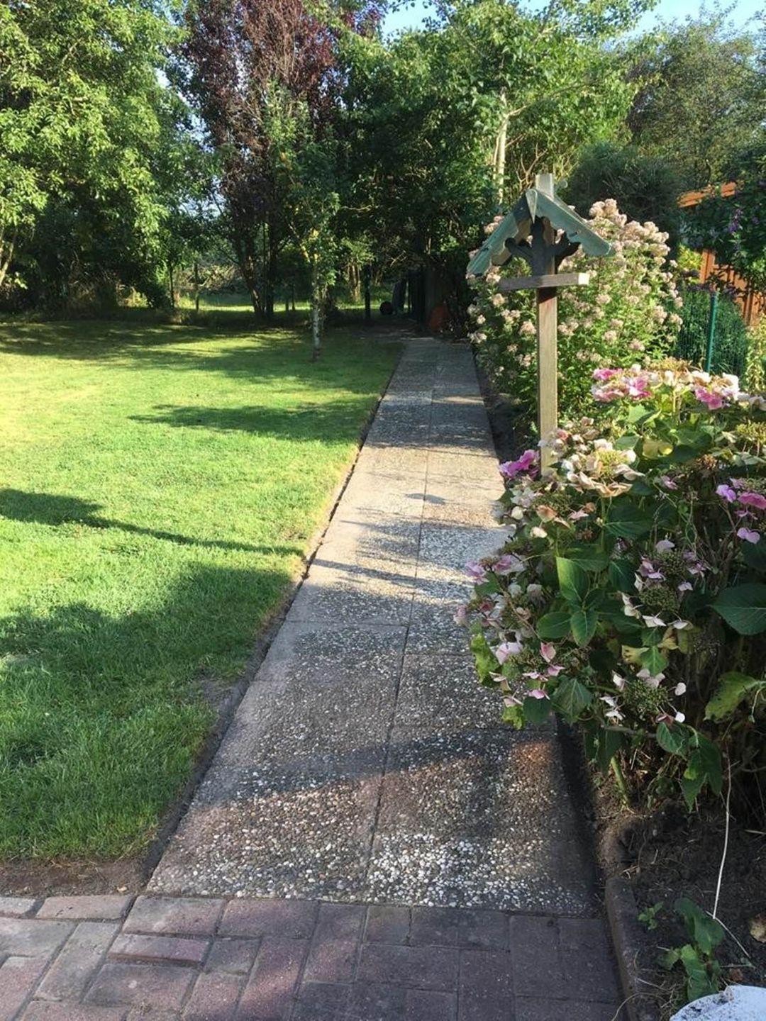 Die Haushälfte verfügt über eine eigene Terrasse und einen weitreichenden Garten. Die Terrasse ermöglicht es an lauen Sommerabenden bei einem gemeinsamen Grillen oder einem kühlen Glas Wein zu verweilen. Der Garten versprüht einen idyllischen Charme mit dem alten Baumbestand. Der Garten hat an einer Seite einen Graben, die anderen Seiten sind geschlossen.