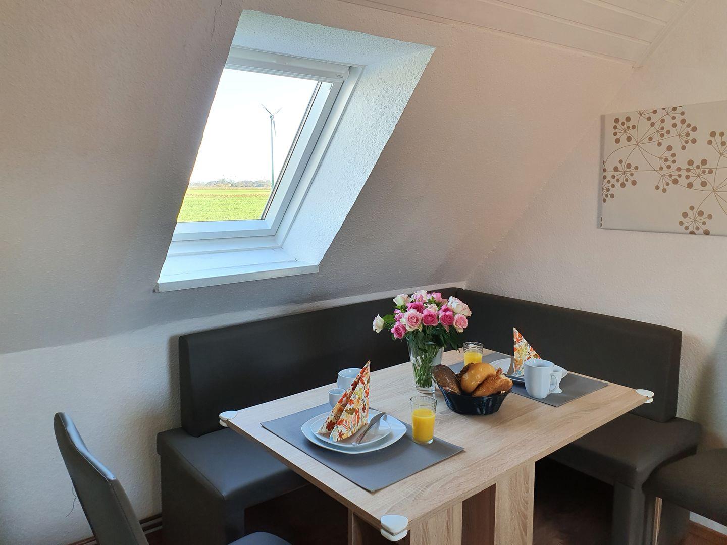 Es liegt direkt am Deich, dahinter der Norddeicher Hafen. Es bietet Platz auf 150m² für bis zu 9 Personen + Kleinkind.