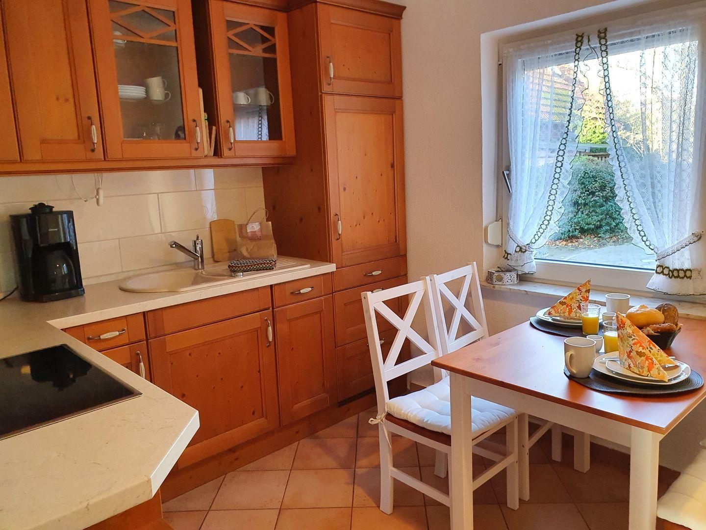 Angrenzend erreichen Sie die Küche. Auch hier gibt es Sitzmöglichkeiten. Die Küche ist mit allem, was man braucht ausgestattet.