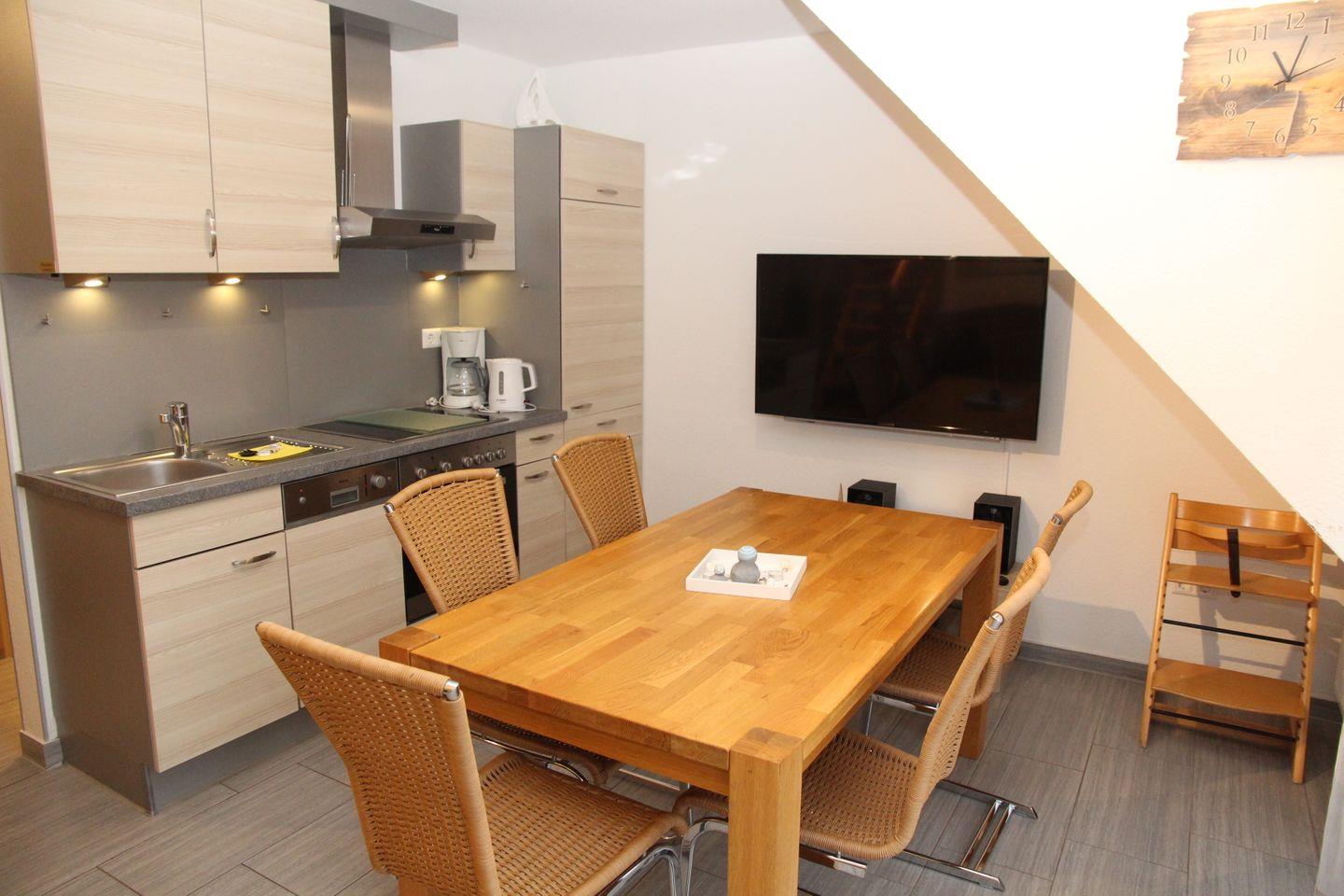 Im Wohnbereich finden Sie ein gemütliches L-Sofa, das auch über eine Schlaffunktion verfügt, den Esstisch mit 5 Stühlen, einen großen Flachbildfernseher mit Hifi-Anlage, sowie die komplett ausgestattete Küche. In der Küche finden Sie u.a. Ceran-Kochfeld, Kühlschrank mit integriertem Gefrierfach, Kaffeemaschine, Mikrowelle, Backofen, Wasserkocher, Toaster.