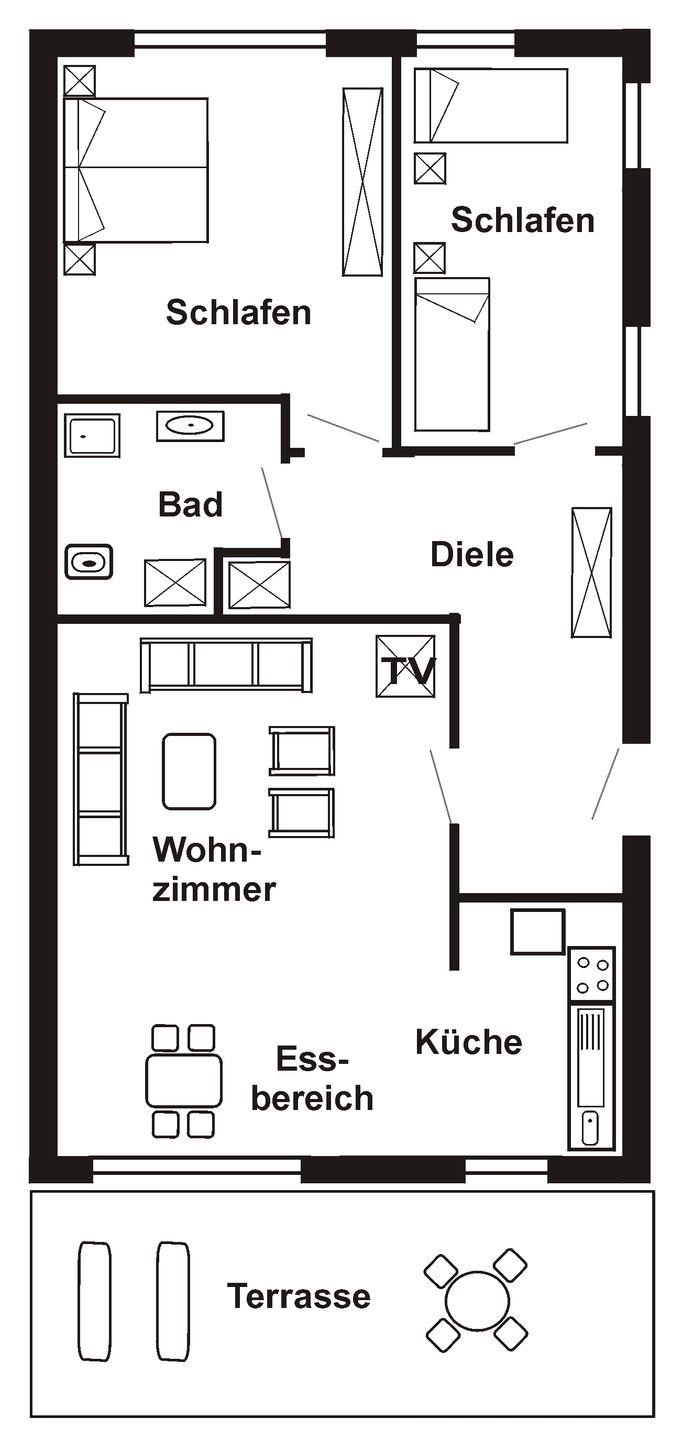 Der Bungalow hat eine Wohnfläche von ca. 60 m² und bietet genügend Platz für bis zu 4 Personen.
