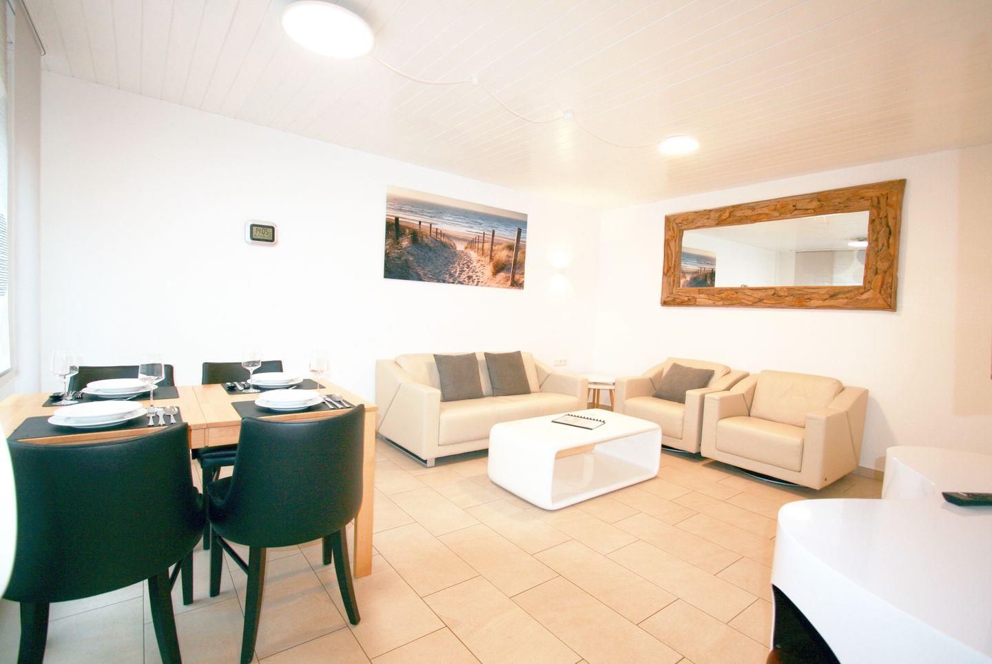 Das große, helle Wohn- und Esszimmer ist geschmackvoll und modern eingerichtet. Es ist ausgestattet mit schnellem WLAN und einem 4K Smart TV und einem DAB Radio. Vom Wohnzimmer aus gelangen Sie zur offenen, voll ausgestatteten Küche mit Geschirrspüler. In den hellen, freundlichen Wohnraum wurde ein Essbereich integriert.