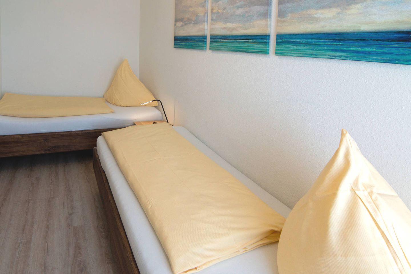Ferner verfügt der Bungalow über 2 Schlafzimmer (1x mit Doppelbett 180x200cm, 2x Einzelbetten 90x200cm) sowie ein modernes Duschbad.