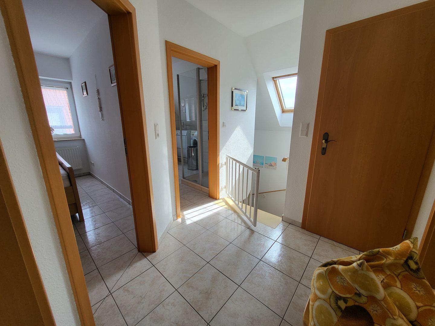 Unser Haus verfügt über 3 Schlafzimmer, zwei Badezimmer und ein Gäste-WC. Das Erdgeschoss sowie das Bad im Obergeschoss sind mit einer Fußbodenheizung versehen. Waschmaschine und Wäschetrockner sind im oberen Badezimmer untergebracht.