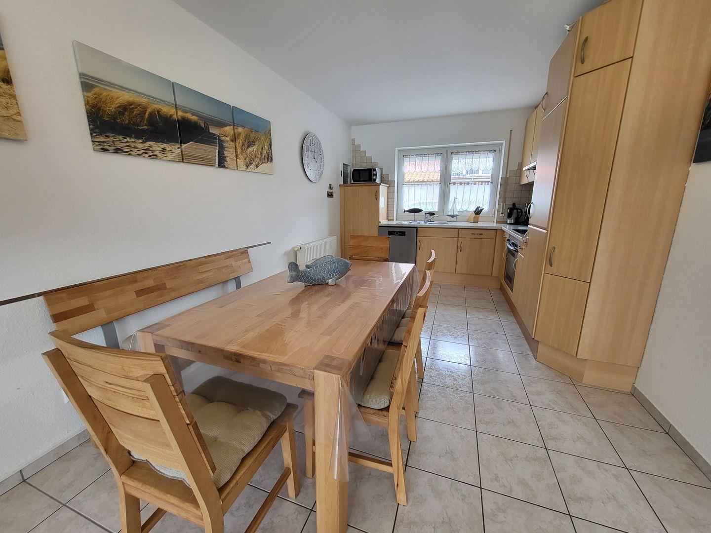 Die Küche ist mit einer Spülmaschine, 2 Kühlschränken, einem 4-Zonen Cerankochfeld, Backofen, Mikrowelle, Kaffeemaschine, Wasserkocher, Eierkocher und Toaster ausgestattet. An Kleinutensilien finden Sie vom Korkenzieher bis zum Suppentopf alles was Sie zum Kochen und genussvollen Essen benötigen.