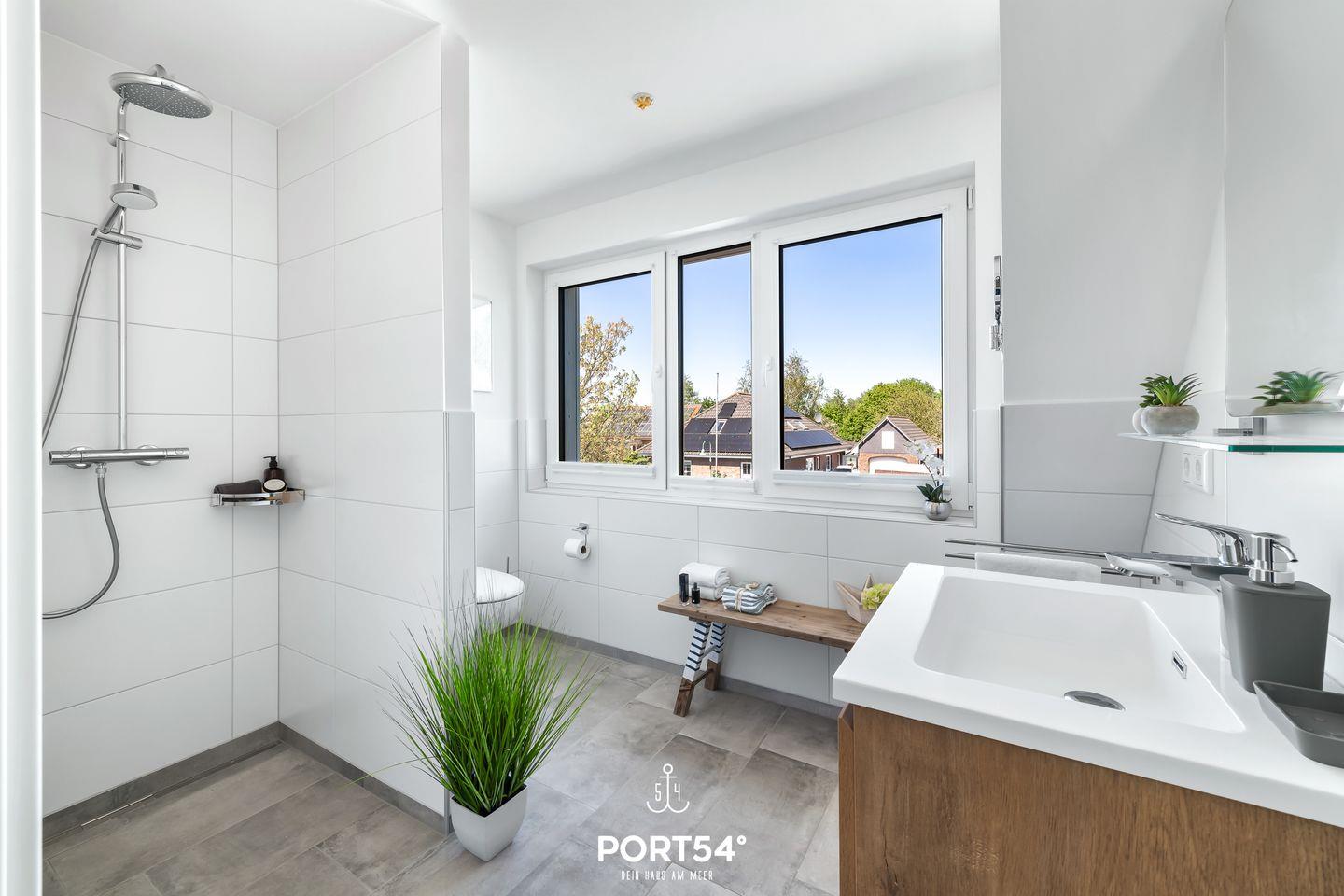 Das Tageslicht-Duschbad punktet einer ebenerdigen Dusche, einem WC sowie einem Waschbecken.