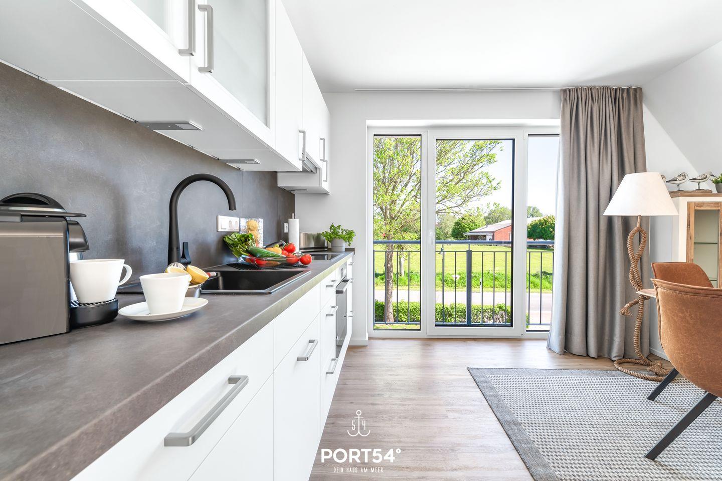 Der helle und freundliche Wohnbereich ist mit einer gemütlichen Wohnlandschaft inklusive Schlaffunktion (250x160cm) und einem Flachbild-TV ausgestattet. Die angrenzende offene moderne Küche bietet alle Annehmlichkeiten, die für einen geselligen Kochabend benötigt werden. Am Esstisch mit bequemen Stühlen können Sie gemeinsam essen oder einen Spieleabend verbringen. Von hier aus gelangen Sie auf den vollmöblierten Balkon.
