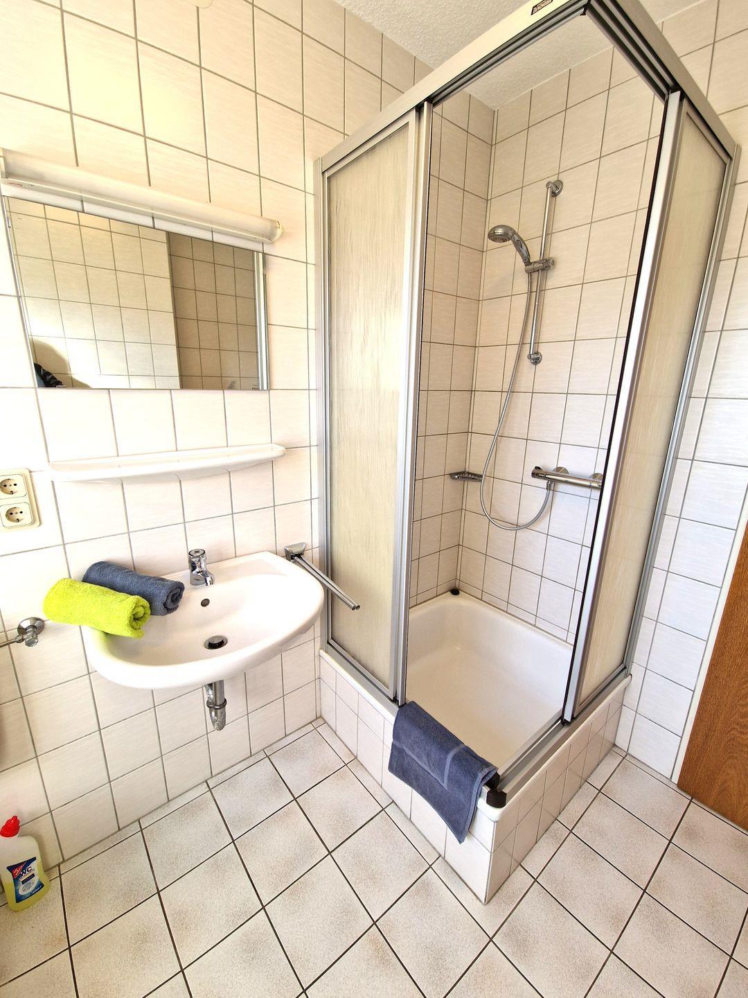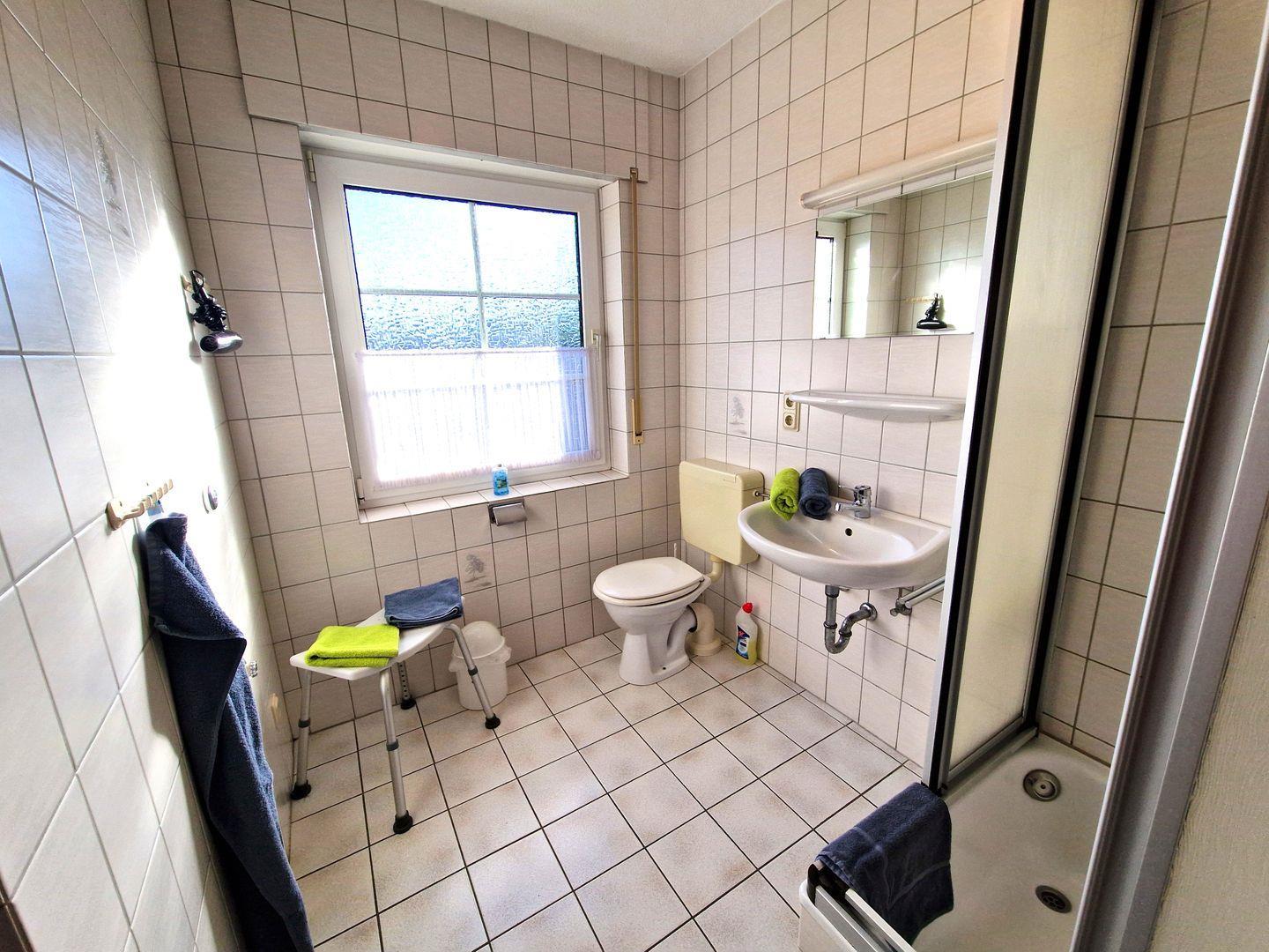 Das Bad ist mit Dusche und Fenster ausgestattet.
