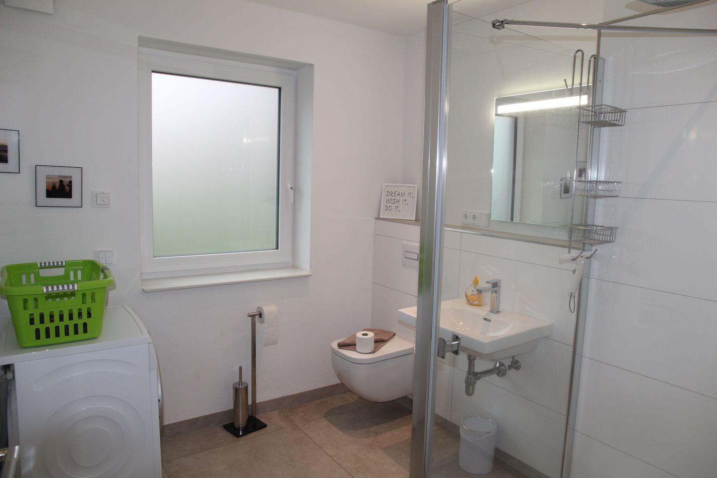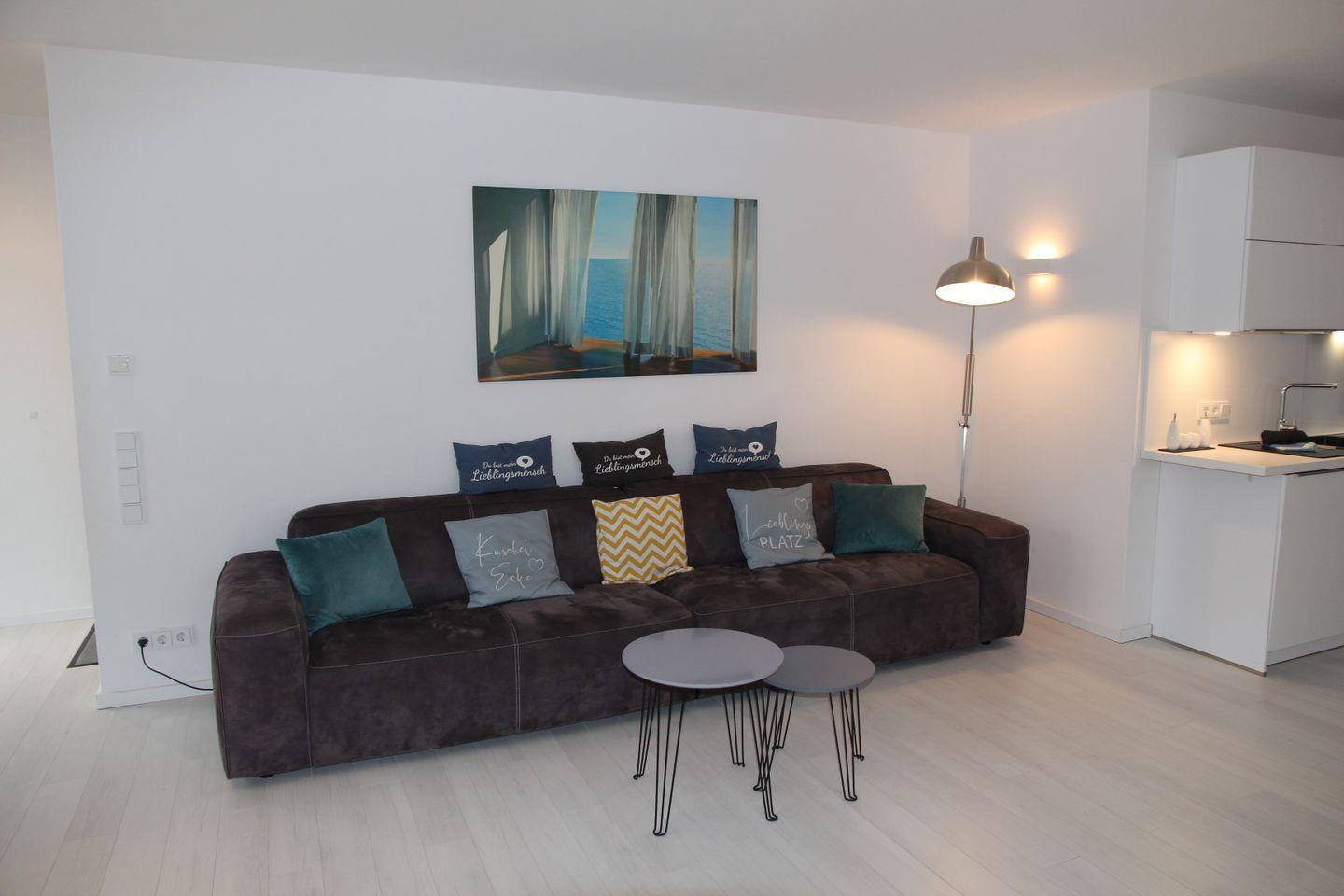Der eigene Eingang direkt vom Parkplatz aus führt Sie direkt in den kleinen Flur, von dem aus Sie in den großzügigen Wohnbereich eintreten können. Hier befinden sich ein großes Sofa mit Blick auf den großen TV, sowie der Essbereich mit Sitzplätzen für 7 Personen und die vollausgestattete Küche, die u.a. über Geschirrspülmaschine, Backofen, Cerankochfeld, großen Kühlschrank mit Gefrierfach, Mikrowelle, Kaffeemaschine, Nespresso-Kapselmaschine, Wasserkocher und Toaster verfügt. Vom Wohnbereich gelangt man auch direkt auf die möblierte (6 Stühle, Tisch, Sonnenschirm) Terrasse mit Gartenbereich, der von einer kleinen Hecke umgeben ist.