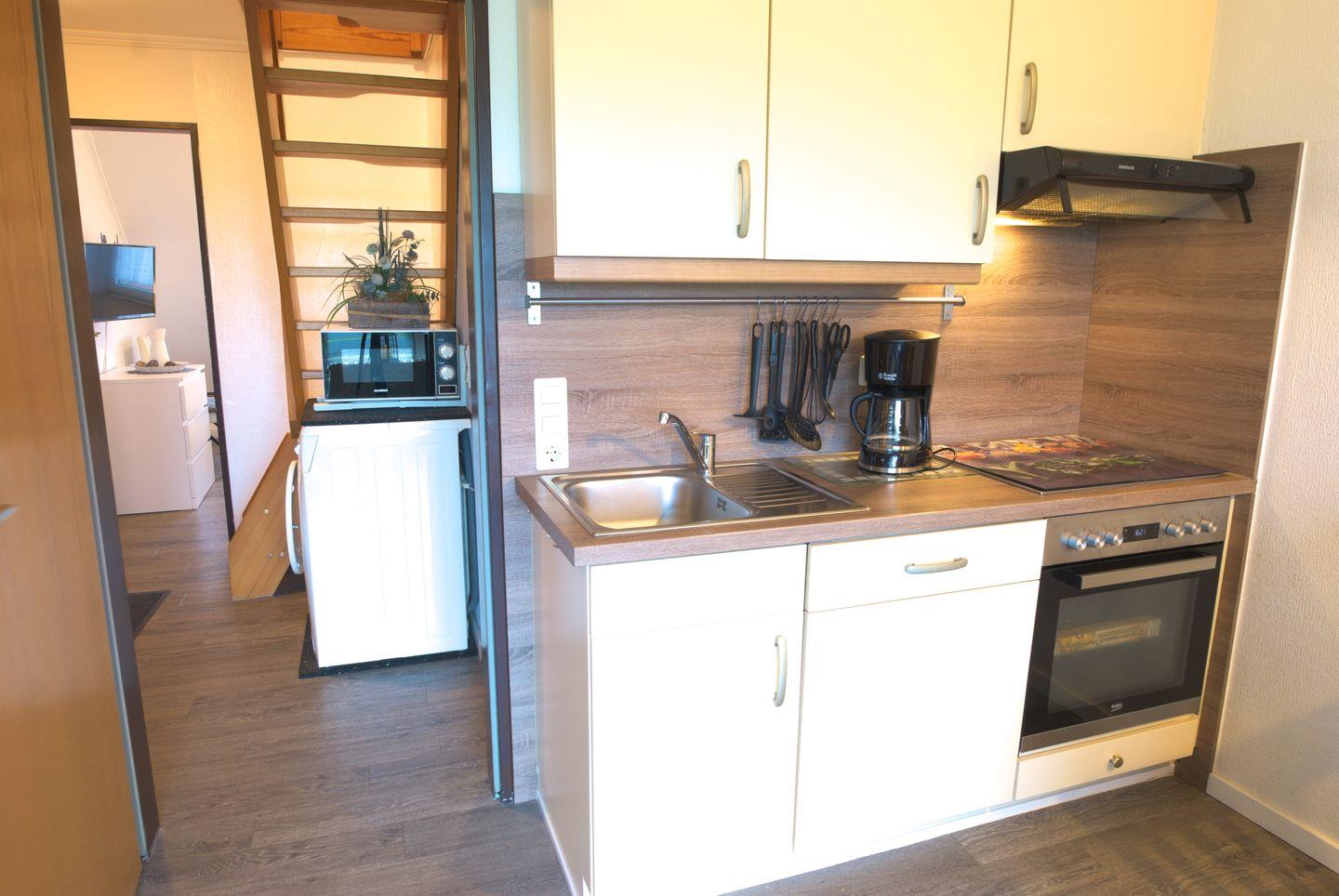 Die Ferienwohnung im Obergeschoss bietet ein Elternschlafzimmer mit Doppelbett, ein Zweibettzimmer und eine komplett ausgestattete Einbauküche mit Ceran-Kochfeld, Backofen, Spülmaschine und Mikrowelle. Im Wohnzimmer mit Essecke gibt es ein TV, 2 weitere TV-Geräte befinden sich in den Schlafzimmern. Das Bad ist mit Dusche und WC ausgestattet. Ein Balkon mit Gartenmöbeln und ein Gemeinschaftsschuppen für Fahrräder stehen zur Verfügung. Haustiere nach Absprache.