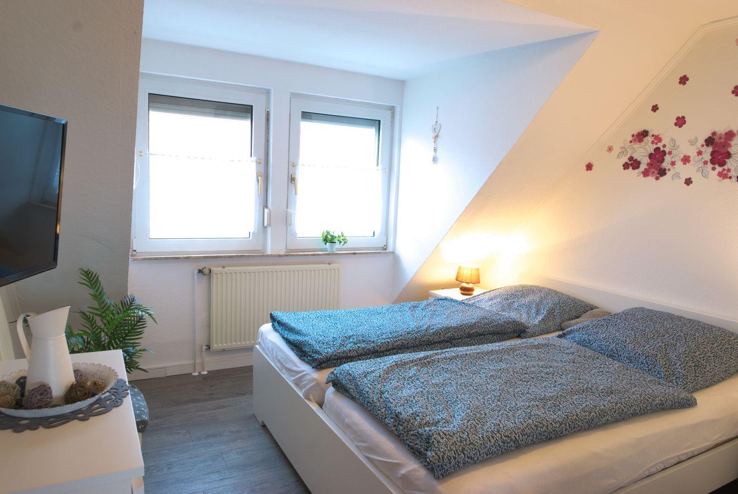 Die Ferienwohnung im Obergeschoss bietet Platz für bis zu 4 Personen und eignet sich ideal für einen erholsamen Aufenthalt. Sie verfügt über ein Elternschlafzimmer mit Doppelbett und ein Zweibettzimmer, das über eine Treppe innerhalb der Wohnung erreichbar ist. Die komplett ausgestattete Einbauküche mit Ceran-Kochfeld, Backofen, Spülmaschine, Mikrowelle, Wasserkocher und Kaffeemaschine bietet alles, was für eine Selbstversorgung benötigt wird. Im Wohnzimmer mit Essecke sorgen ein Flachbild-TV, DVD-Player und ein Radio mit CD-Player für Unterhaltung. Das Bad ist mit einer Dusche, WC und Waschbecken ausgestattet. Ein Balkon mit Gartenmöbeln lädt zum Entspannen ein und bietet den weitläufigen Blick auf den Deich . Ein Gemeinschaftsschuppen bietet Abstellmöglichkeiten für Fahrräder. Drei TV-Geräte, eines im Wohnzimmer, Schlafzimmer und ein weiteres im oberen Schlafzimmer, bieten zusätzlichen Komfort. Die Wohnung hat eine zentrale Lage, nur 18 Minuten zu Fuß vom Deich entfernt, und 600 m zur Kurverwaltung. Ein kostenloser Parkplatz und ein abschließbarer Schuppen für Fahrräder stehen zur Verfügung. Hunde sind herzlich willkommen.