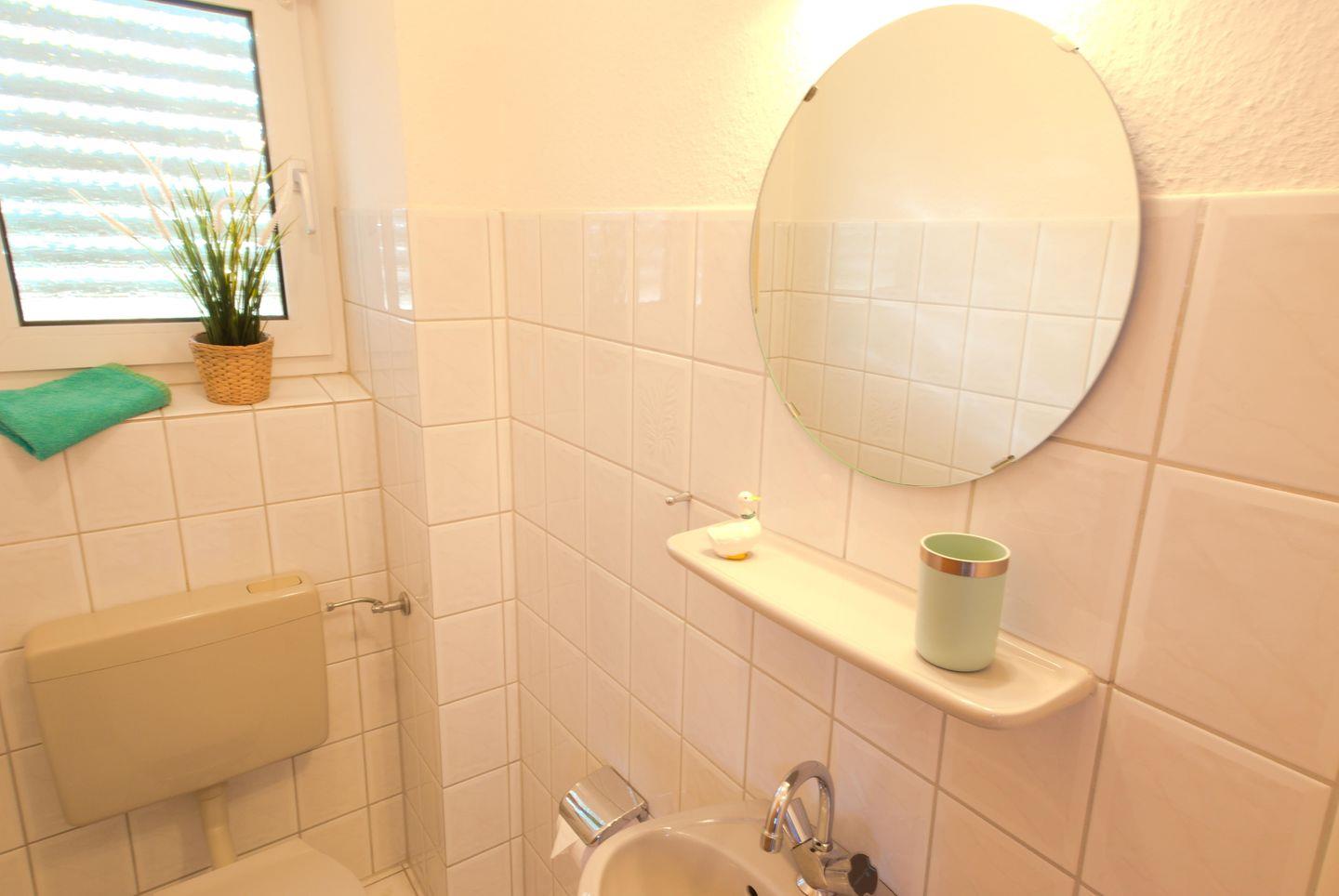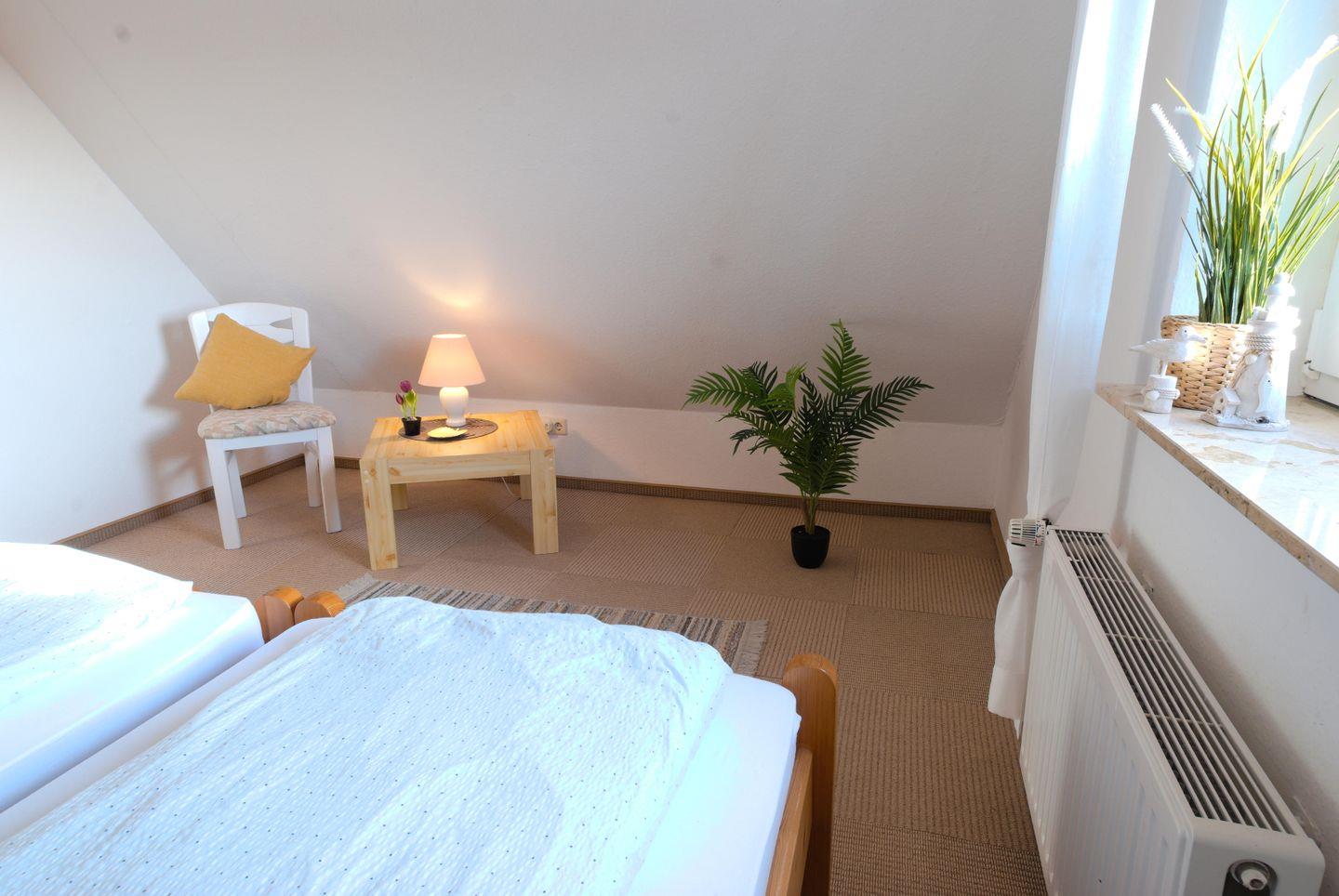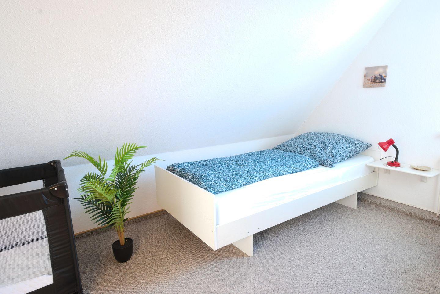 Im ersten Stock befindet sich das Elternschlafzimmer, während das Kinderzimmer mit einem Bett, Schrank und TV nebenan liegt. Im zweiten Stock gibt es ein weiteres Schlafzimmer mit zwei Betten und Kleiderschrank, ein Babyreisebett kann auf Wunsch bereitgestellt werden. Das Badezimmer mit Dusche und WC befindet sich in der ersten Etage, ein weiteres WC ist im Erdgeschoss vorhanden. Eine Waschmaschine ist vorhanden.