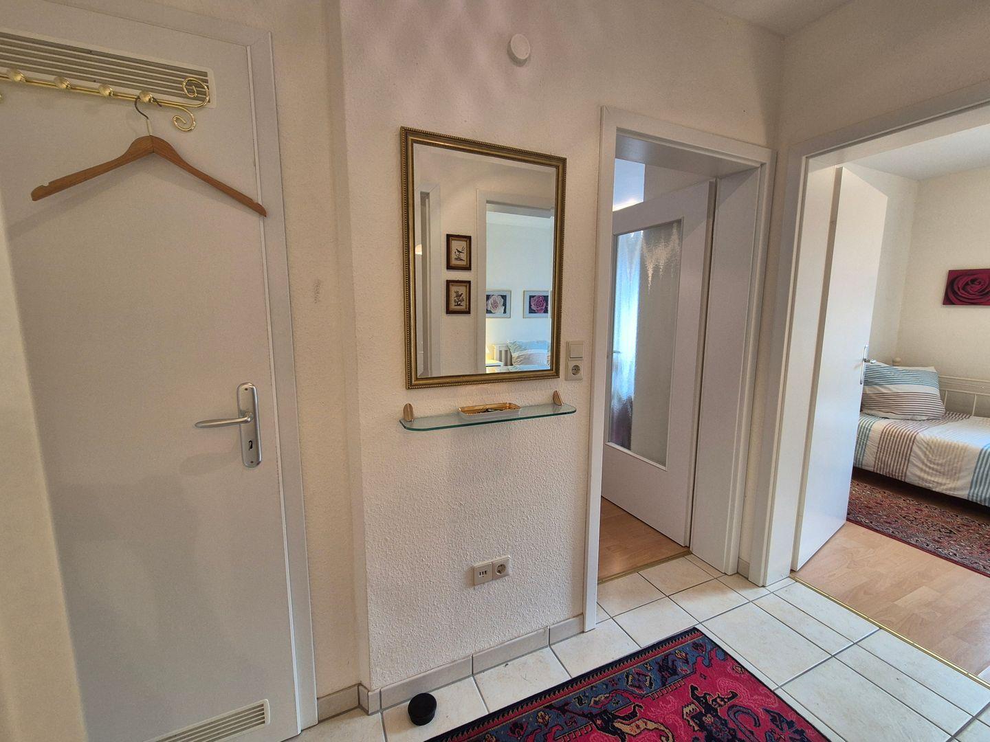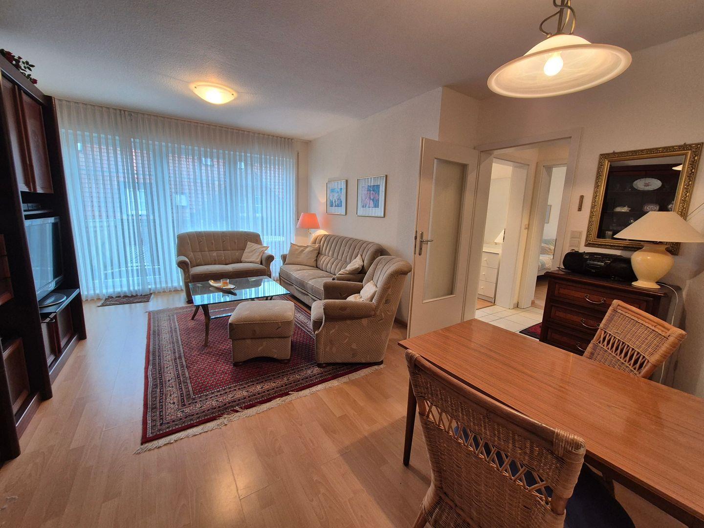 Im Inneren stehen Ihnen ein kombinierter Wohn- und Essbereich mit direktem Zugang zum Balkon zur Verfügung. Des weiteren ein Schlafzimmer mit bequemem Doppelbett und Kleiderschrank und ein Schlafzimmer mit einem Einzelbett. Die Küche bietet Ihnen unter anderem ein Ceran-Kochfeld, kleinen Backofen, Geschirrspüler, Mikrowelle, Kühlschrank, Gefrierschrank, Wasserkocher und Kaffeemaschine-Senseo. Ein schönes Duschbad rundet das Angebot ab.