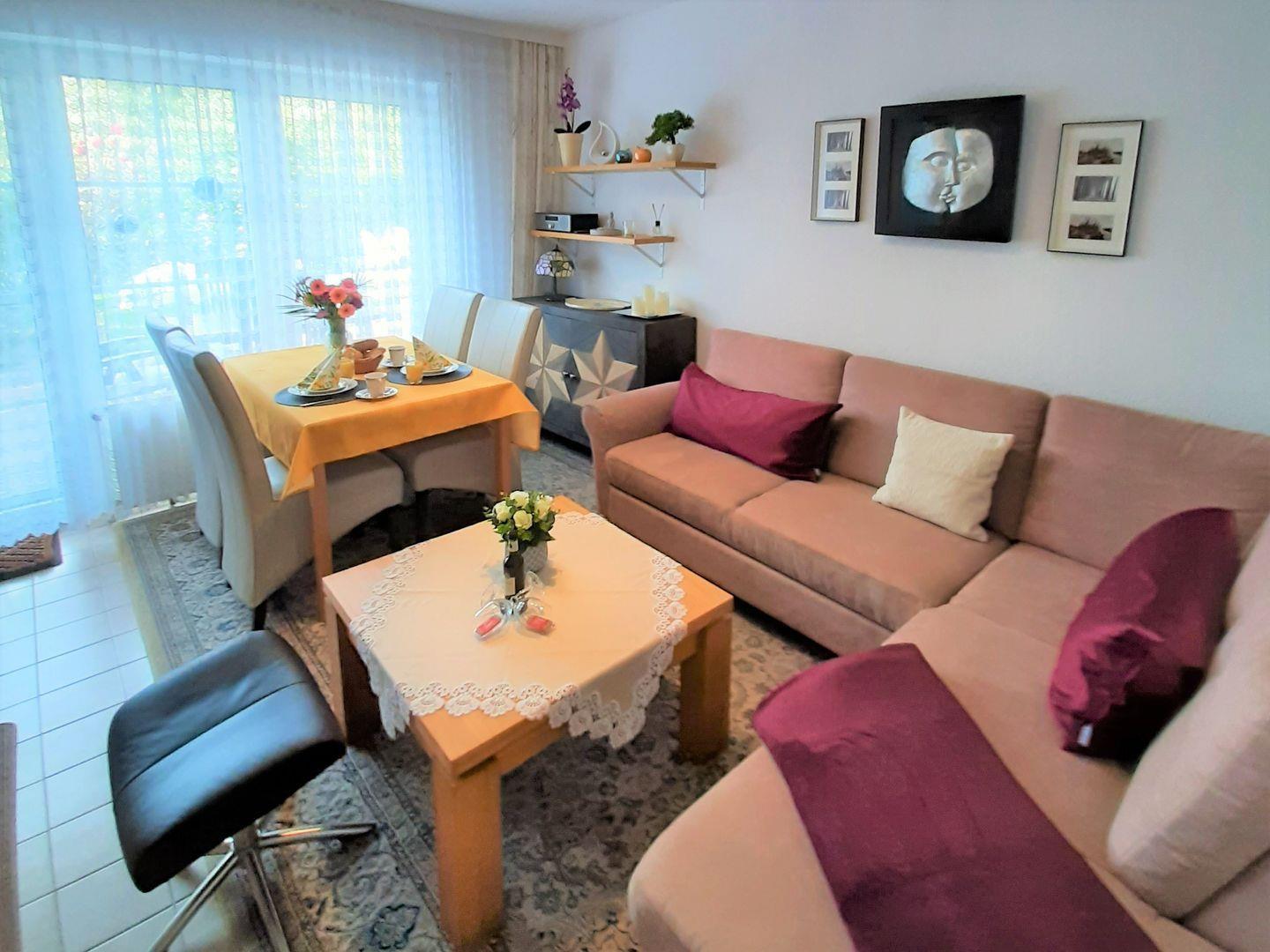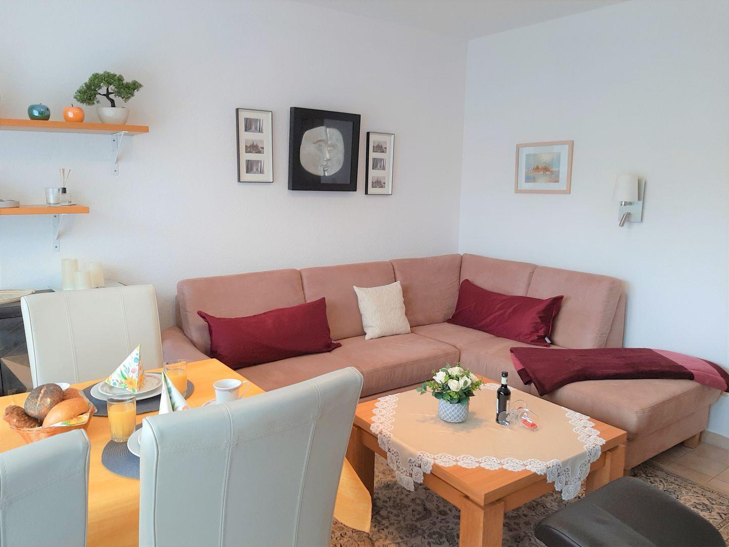 Im Wohnzimmer befindet sich eine Schlafcouch, wo eine 3. Person gemütlich schlafen kann.