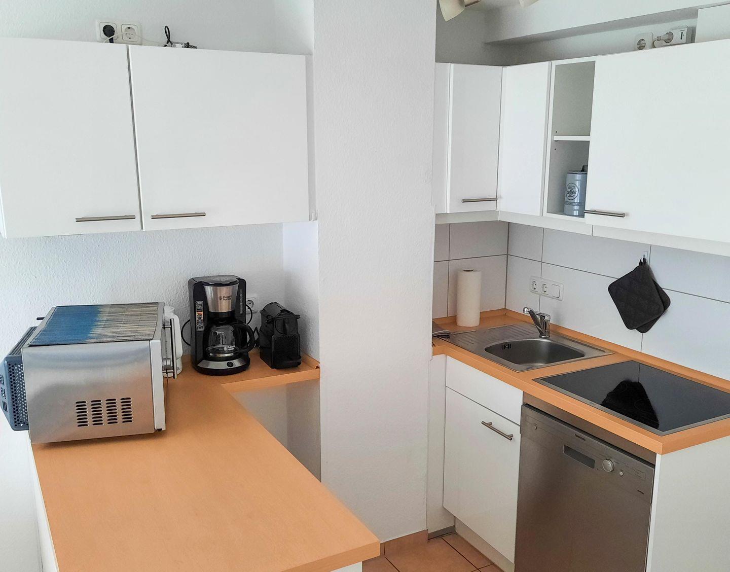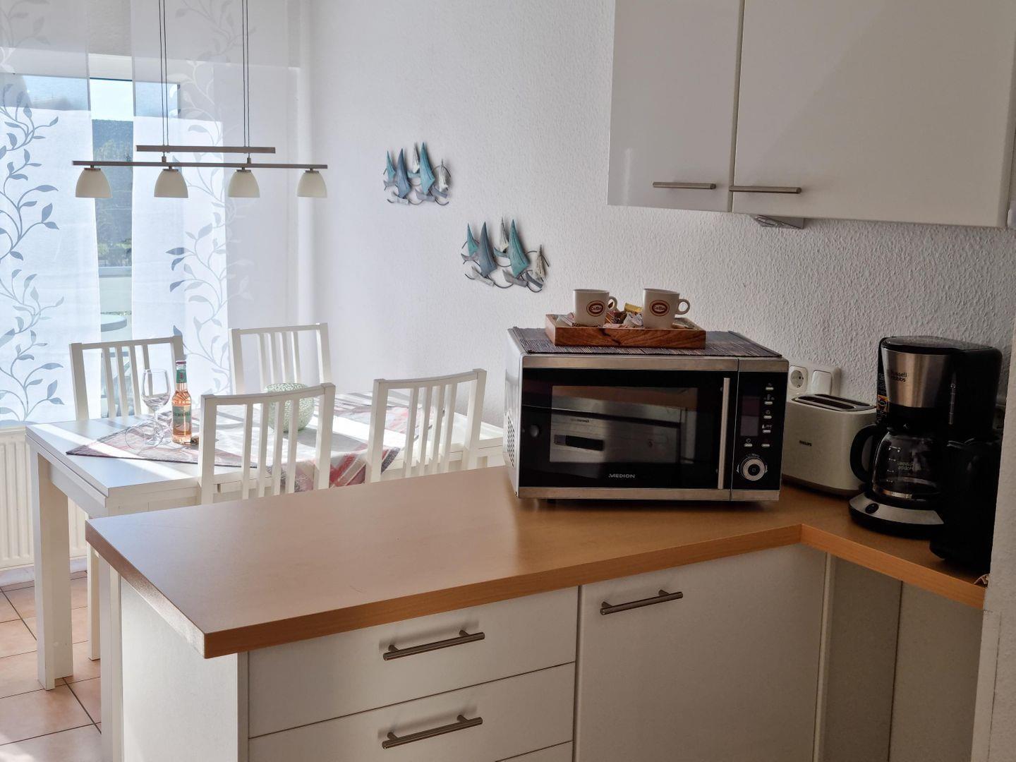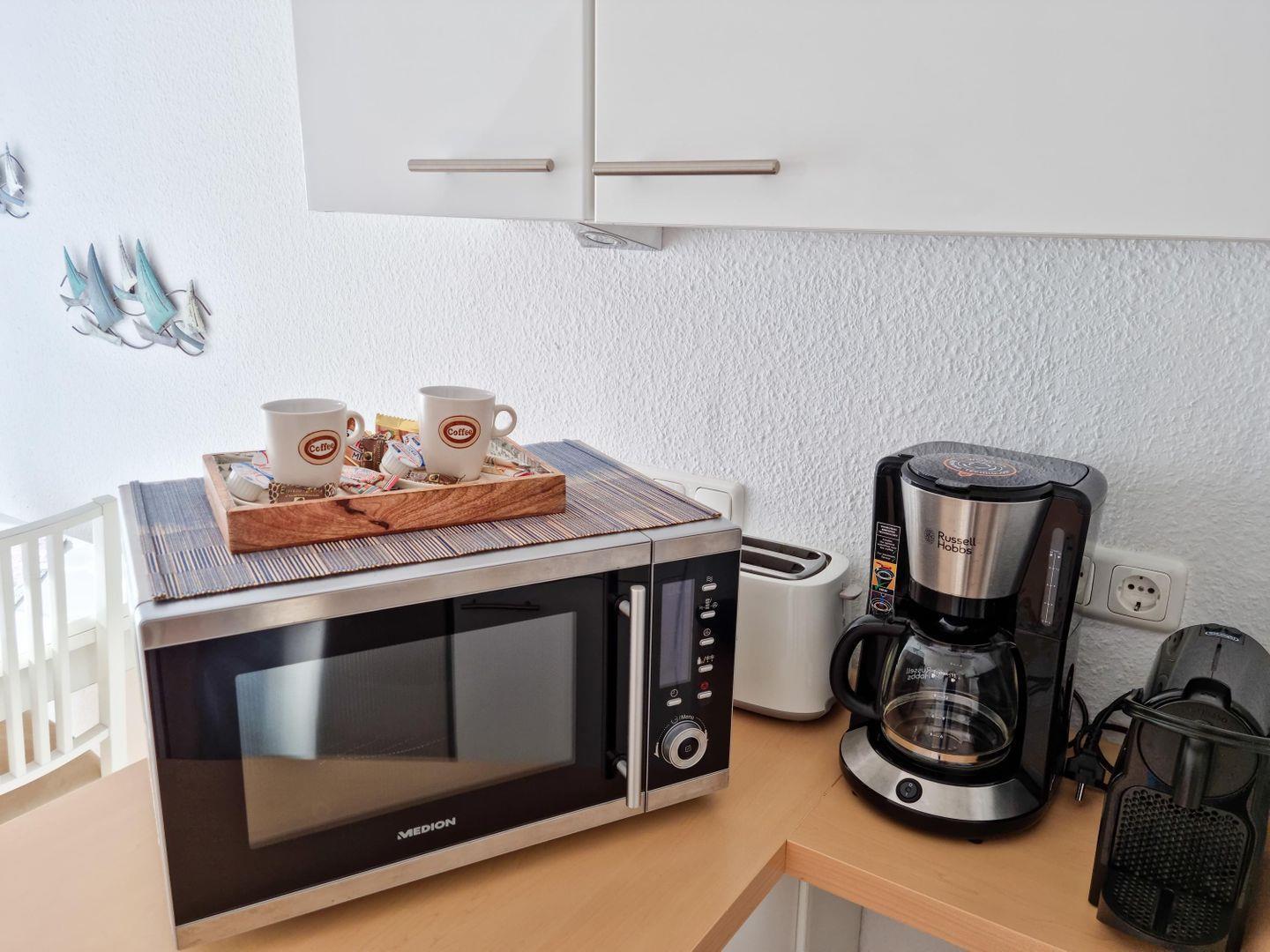 Der großzügige Wohnbereich mit Sofaecke und Esstisch lädt zu gemeinsamen Mahlzeiten und entspannten Abenden ein. Die voll ausgestattete Küche bietet alles, was du brauchst – Cerankochfeld, Mikrowelle, Kühlschrank mit Gefrierfach, Spülmaschine und viele Küchenutensilien. Für einen genussvollen Start in den Tag sorgen die Kaffeemaschine und der Toaster.