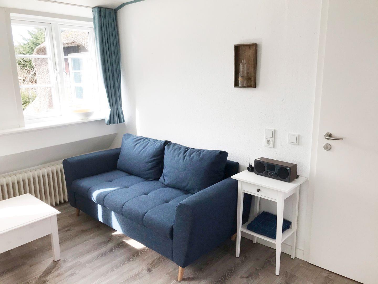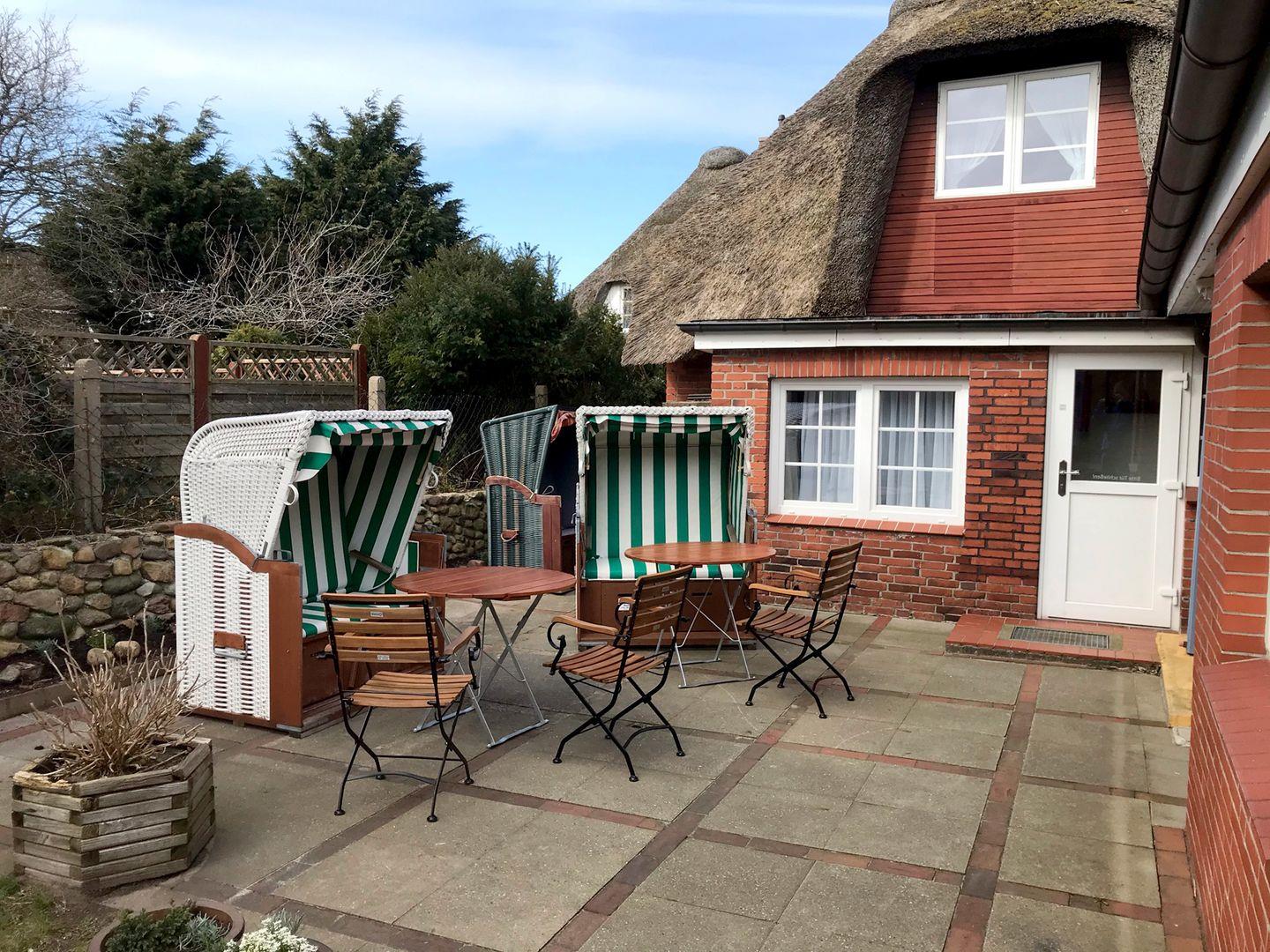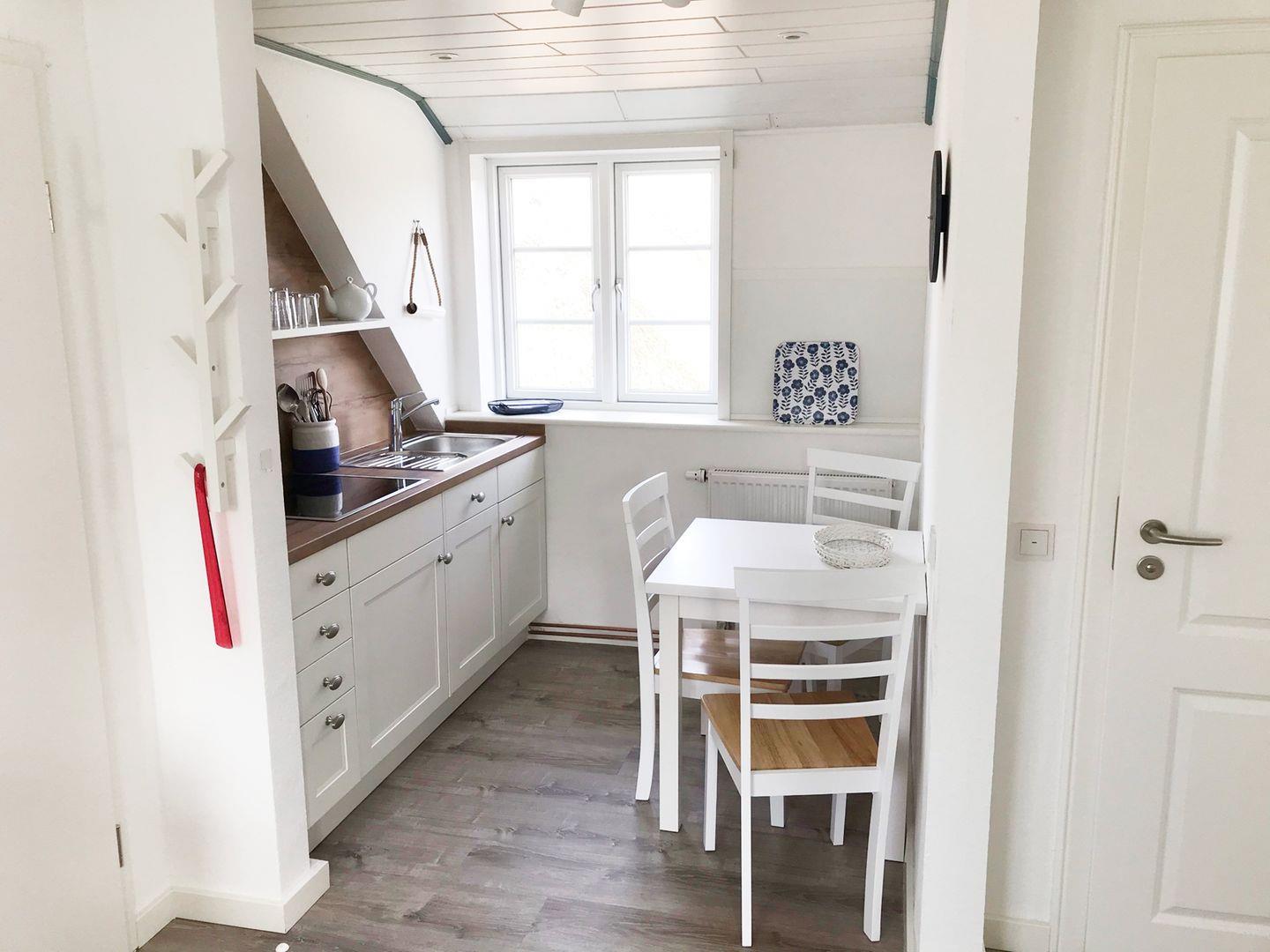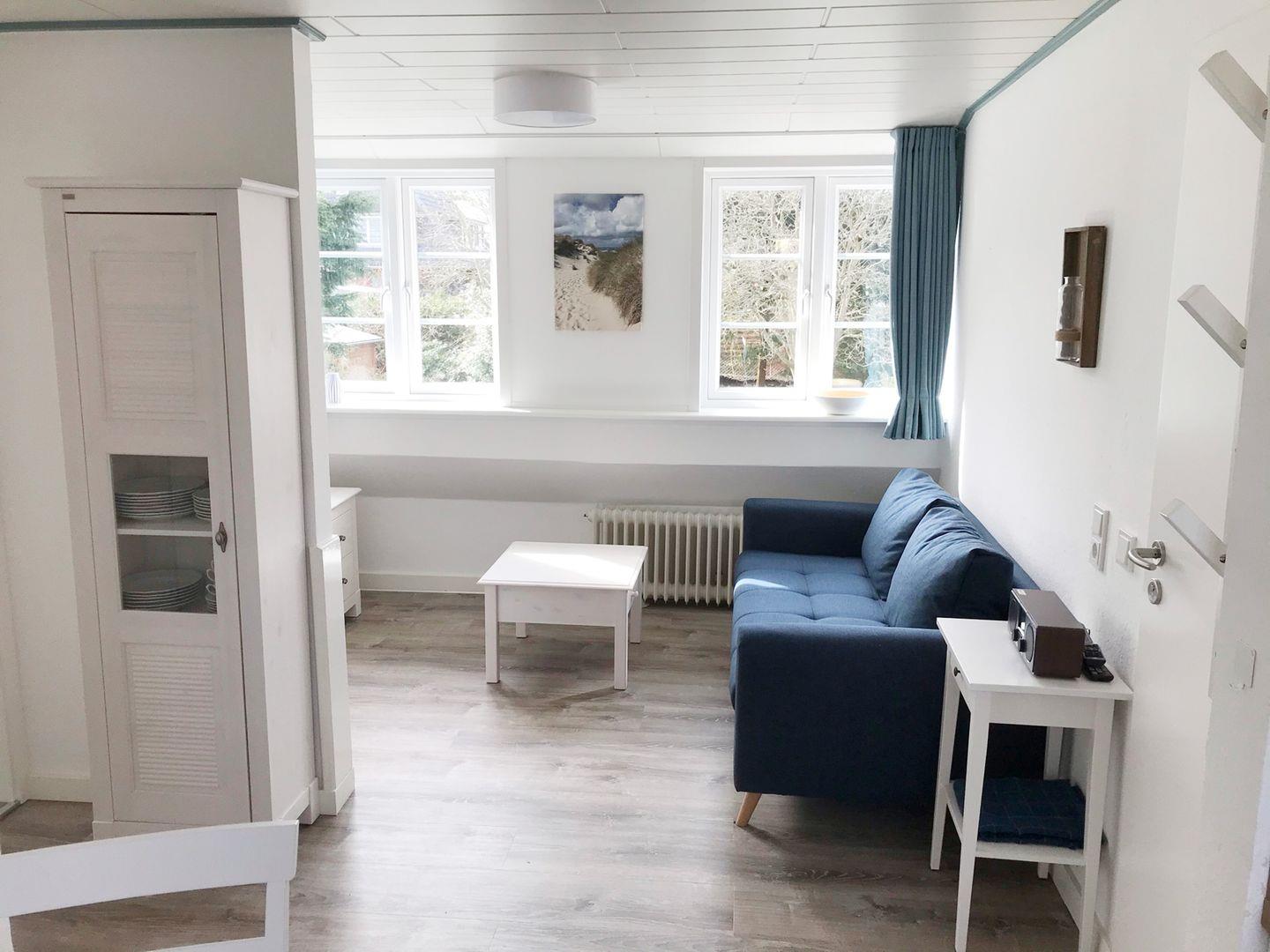 Die Ferienwohnung verfügt über 1 Wohnraum mit WLAN und Sat-TV und offener Küche, 2 Schlafzimmer, 1 Badezimmer mit Dusche und WC; Gemeinschaftsgarten mit Gartenmöbeln und Strandkorb (April bis Oktober).