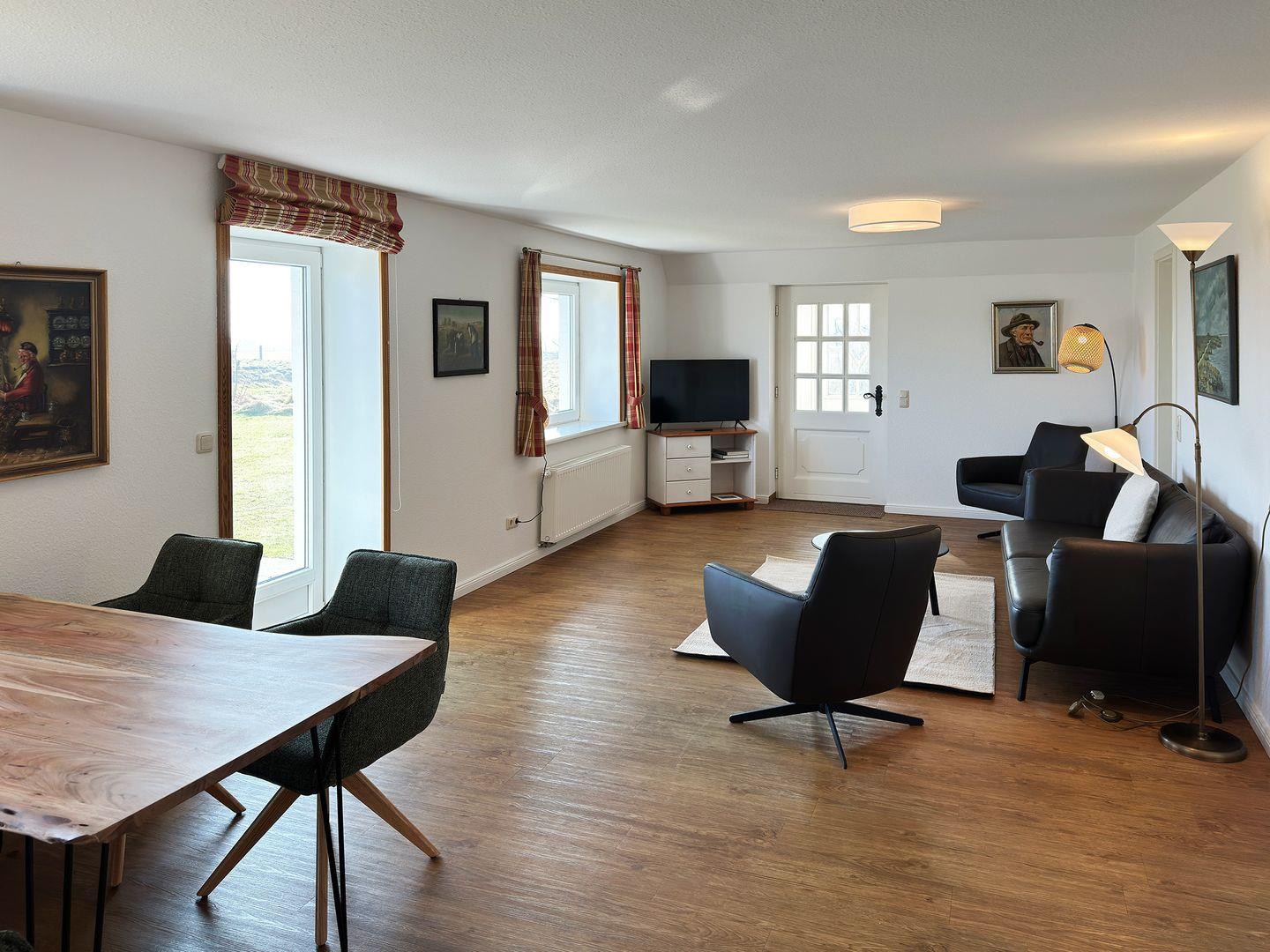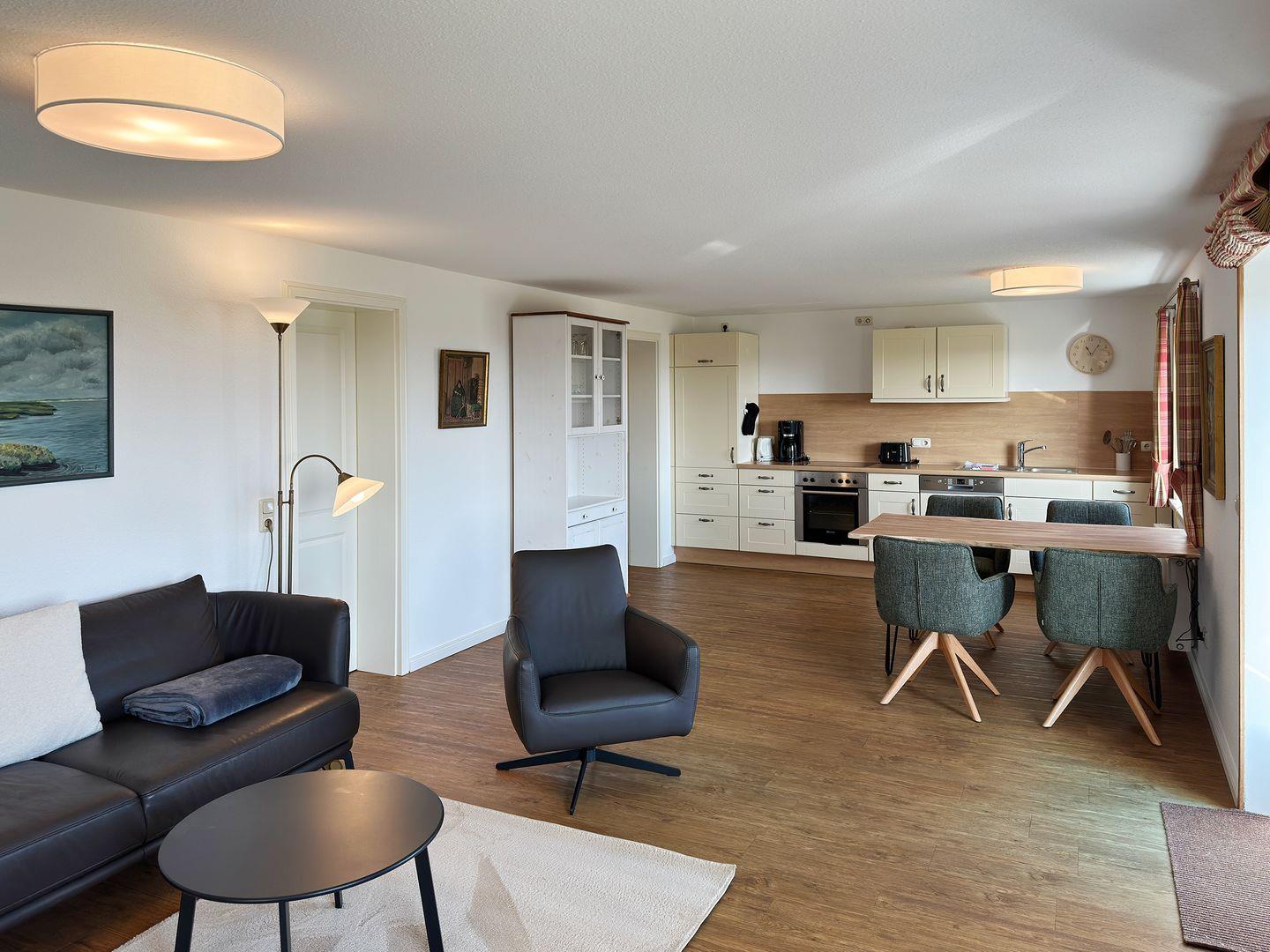 Die Wohnung verfügt über 1 großen Wohnraum mit offener Küche und Sat-TV, 2 Schlafzimmer, 1 Badezimmer mit Dusche und WC, 1 Terrasse mit Gartenmöbeln und 1 Strandkorb (April bis Oktober), 1 Terrasse mit Strandkorb (April bis Oktober). Auf dem Grundstück befindet sich ein Wäscheplatz. Bei Bedarf können Sie die Waschmaschine und den Trockner im Madelwai 7, Haus Strunluuper, nutzen.