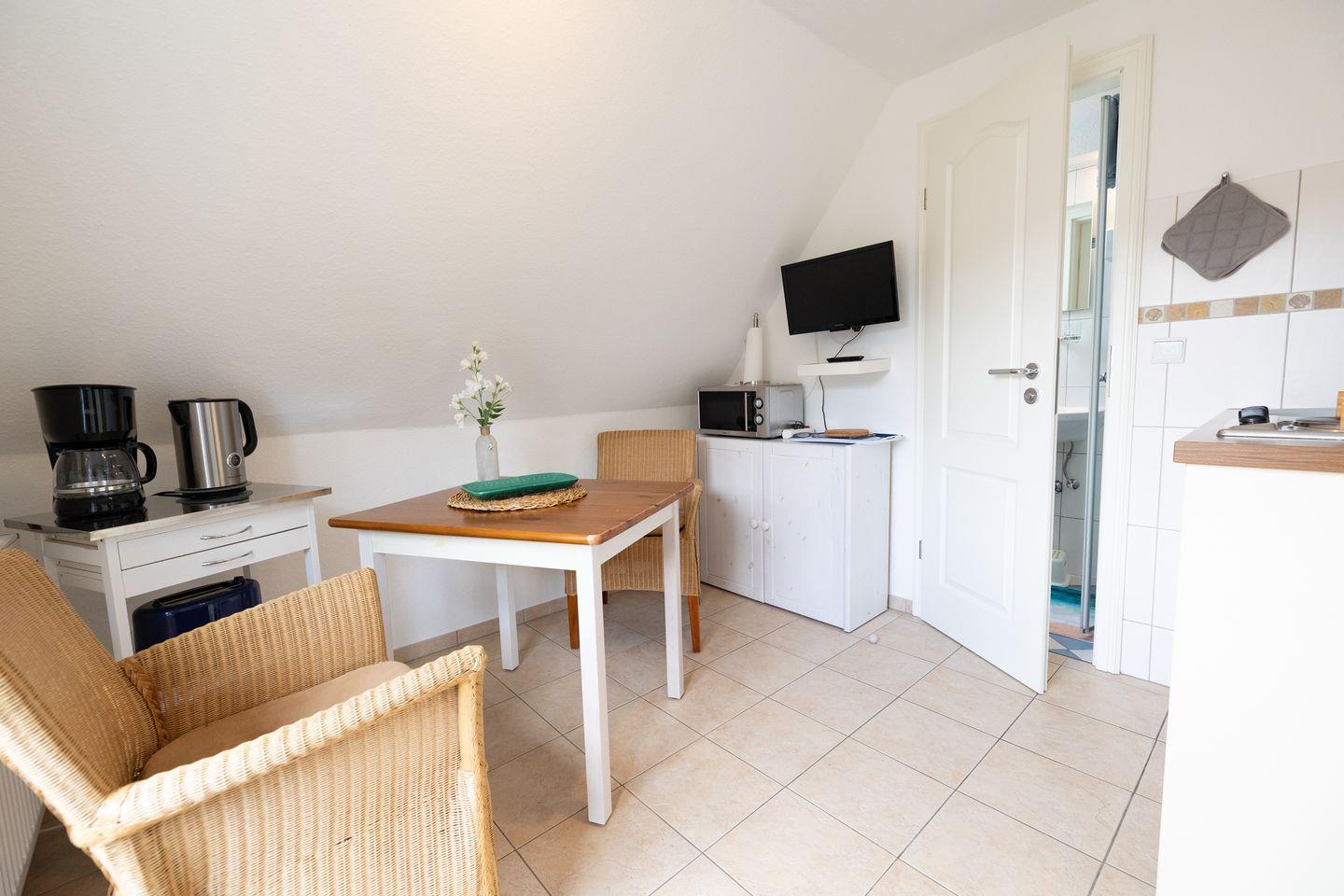 Die Ferienwohnung „Popenstuuv" (Friesisch: Puppenstube) im 1. Obergeschoss des Hauses „Waltraud" in Norddorf auf Amrum ist eine 2-Zimmer-Ferienwohnung (ca. 19 qm Grundfläche) mit Schlafmöglichkeiten für 1 bis 2 Personen.