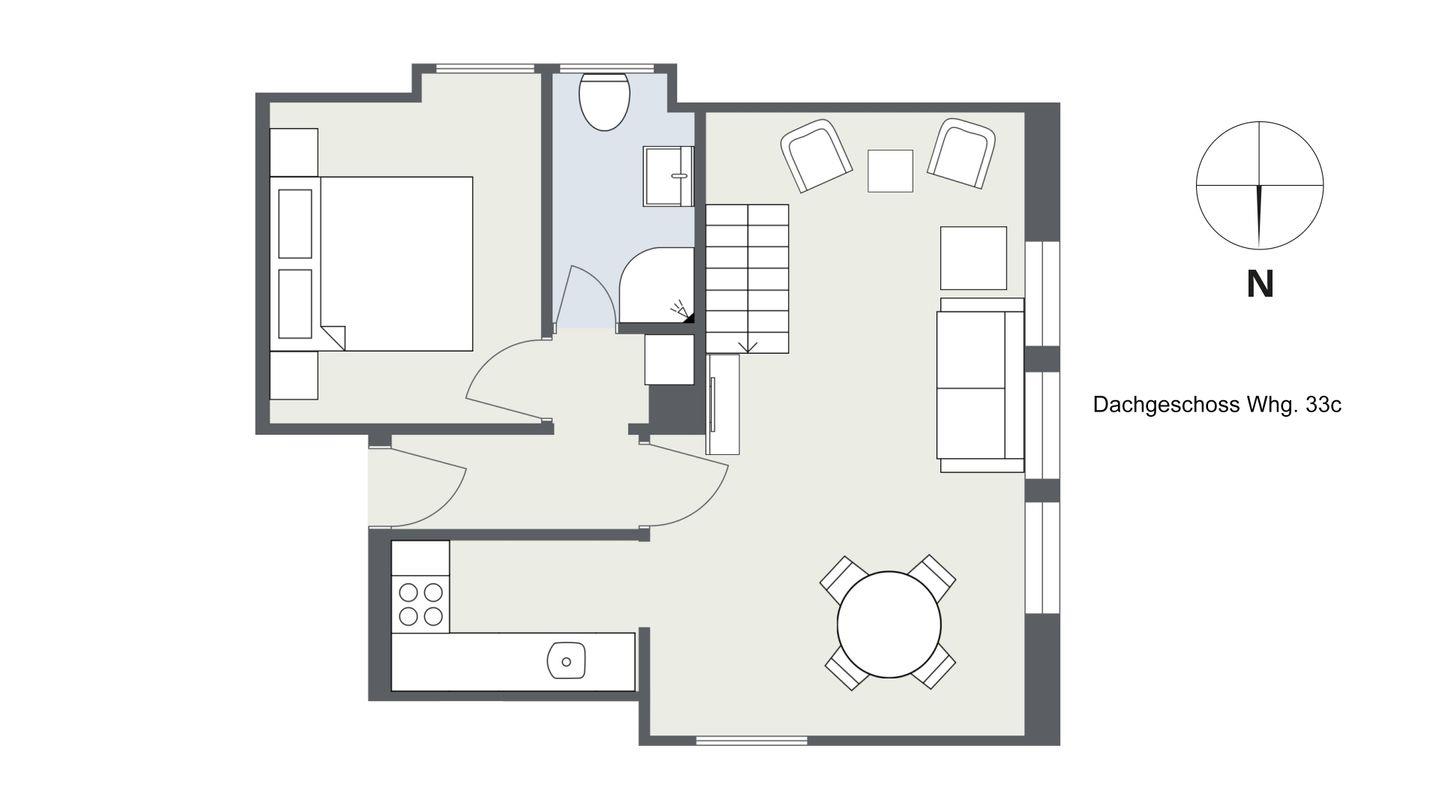Wohn- / Esszimmer, Küche, Duschbad/WC, 1 Doppelschlafzimmer sowie 1 Schlafraum für 2 Personen mit Einzelbetten auf der offenen Empore.