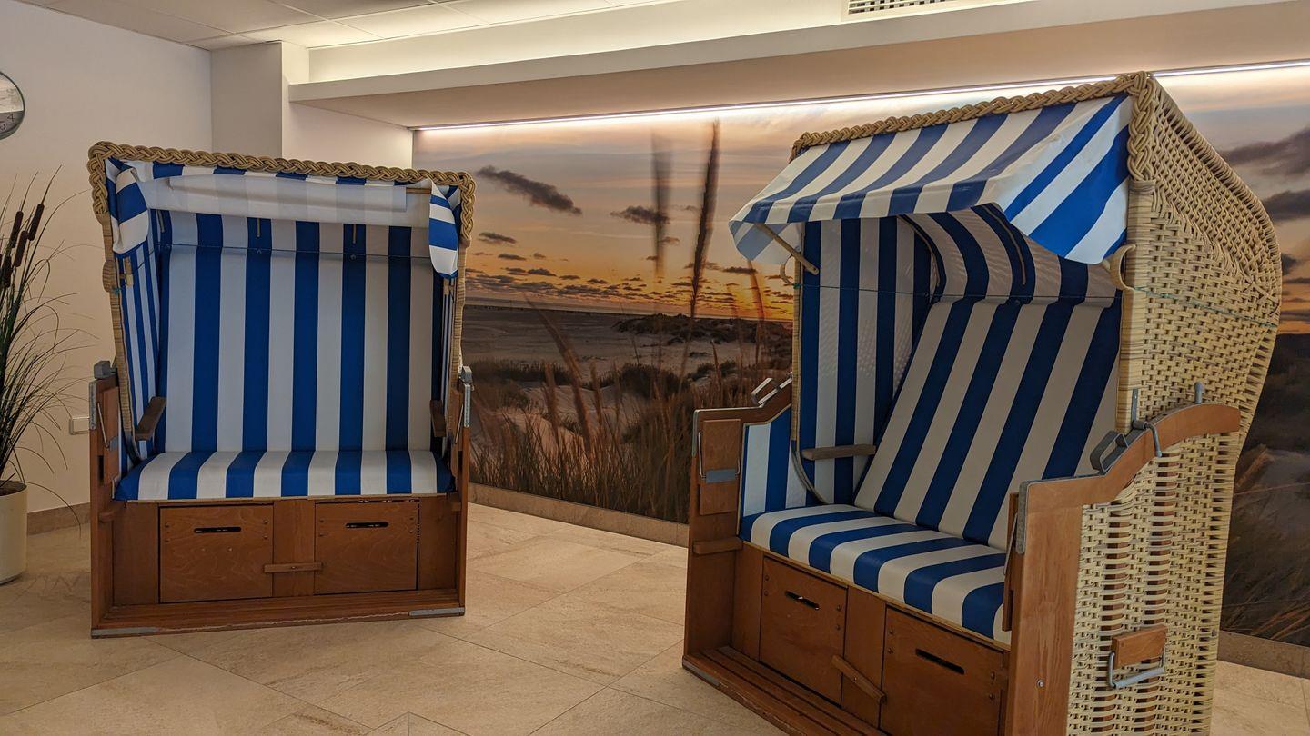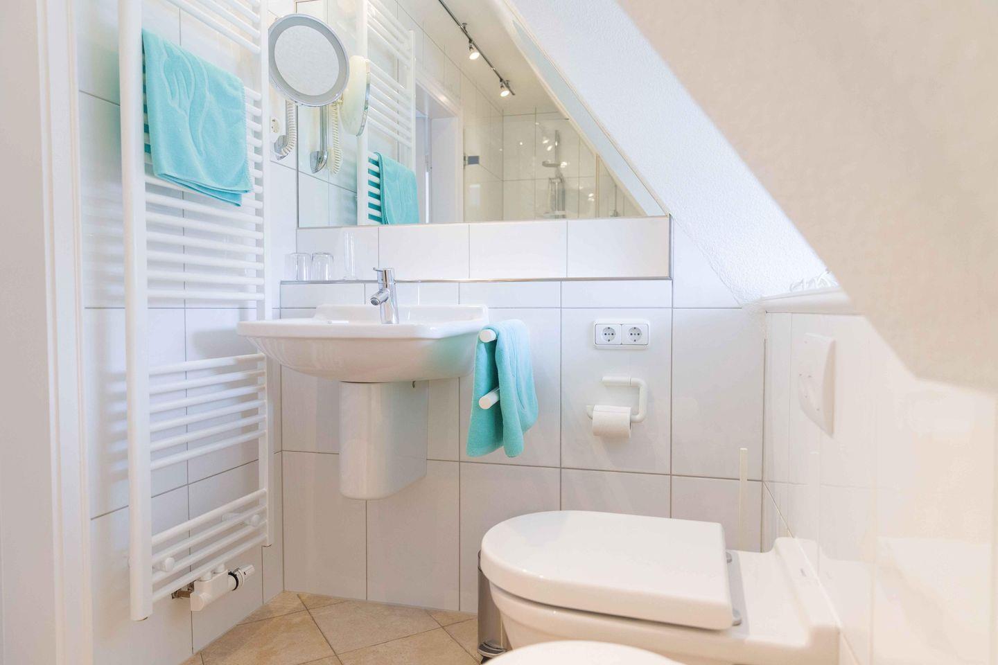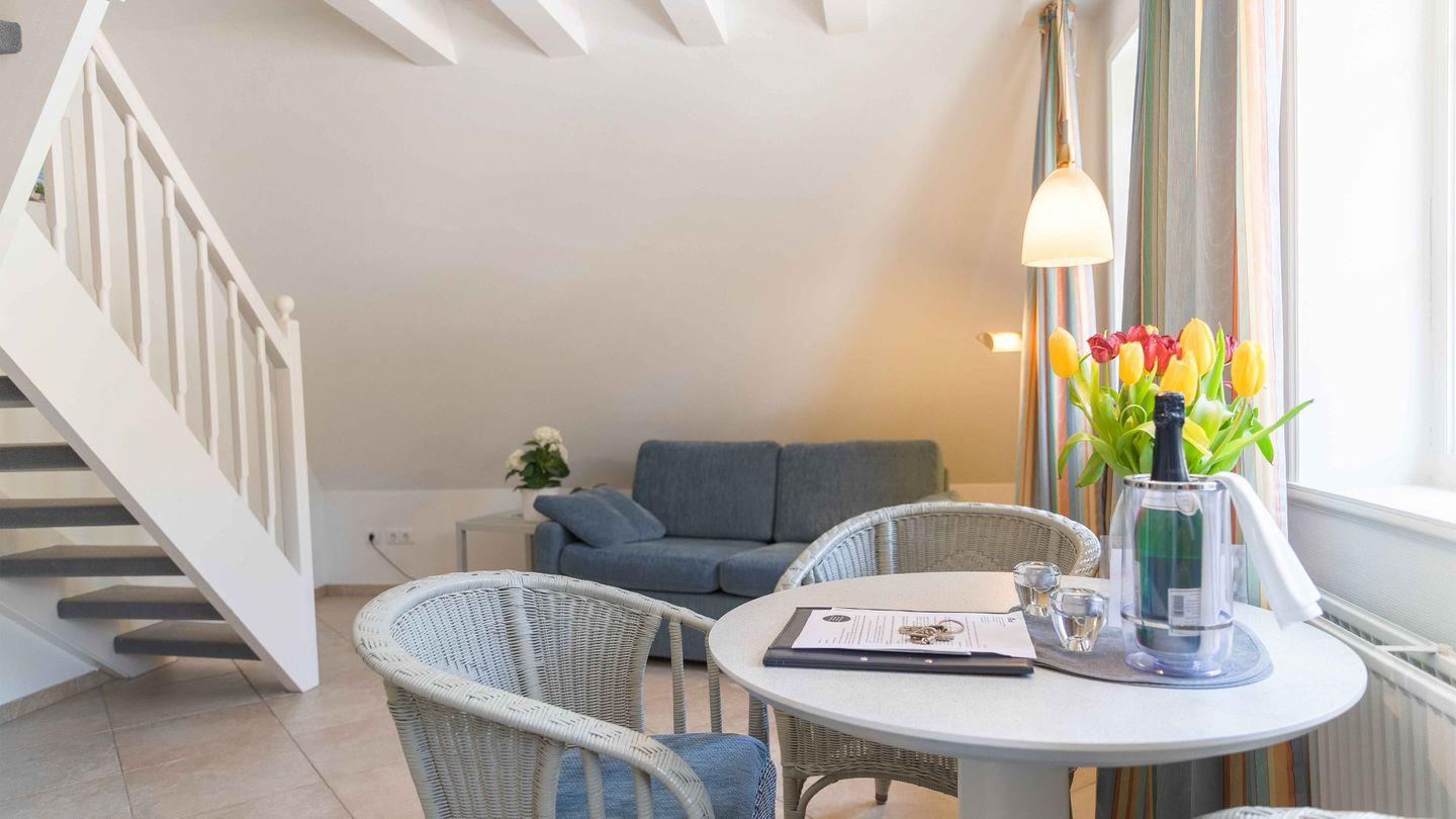 Obergeschoss über 2 Ebenen im Maisonette-Stil – bis zu 3 Personen, ca. 50 qm mit einem Strandkorb im Garten (von Ostern bis Oktober),
